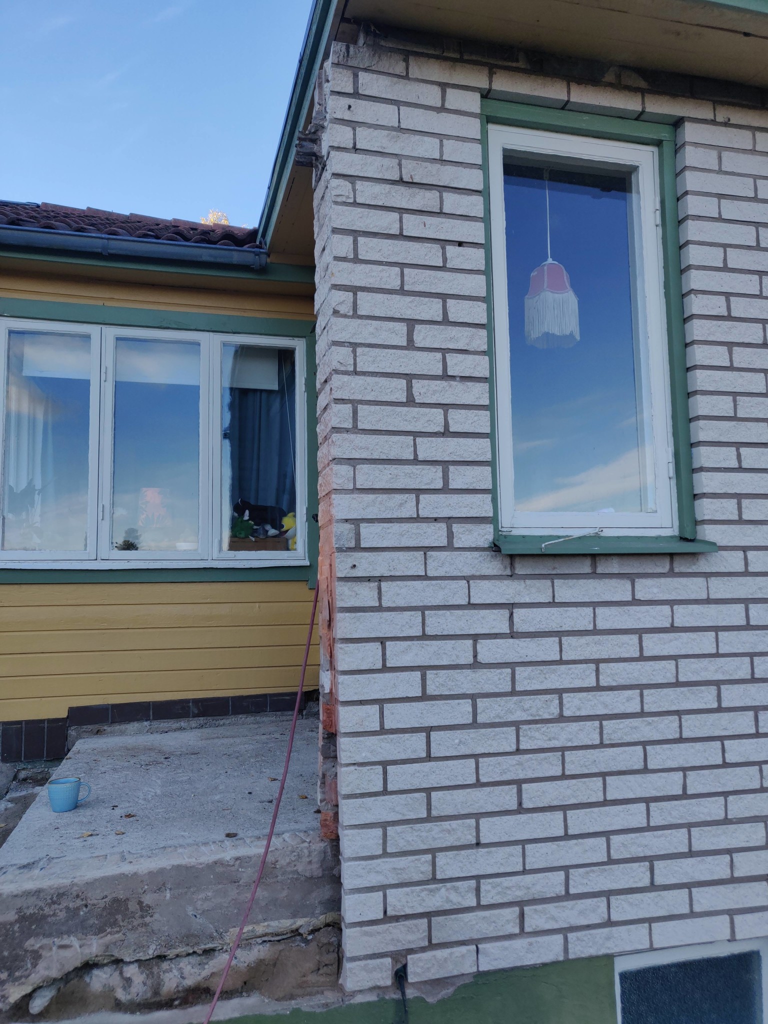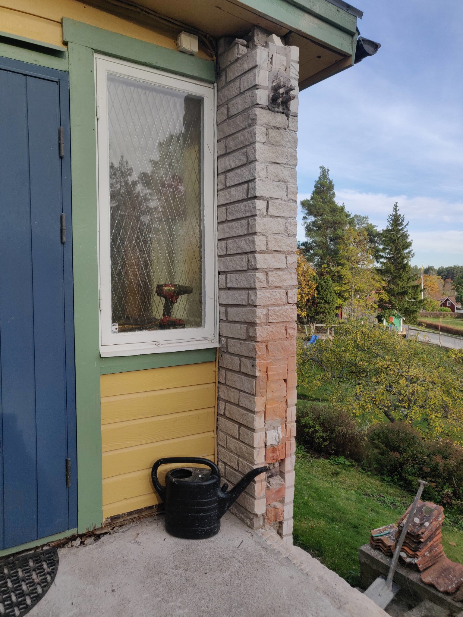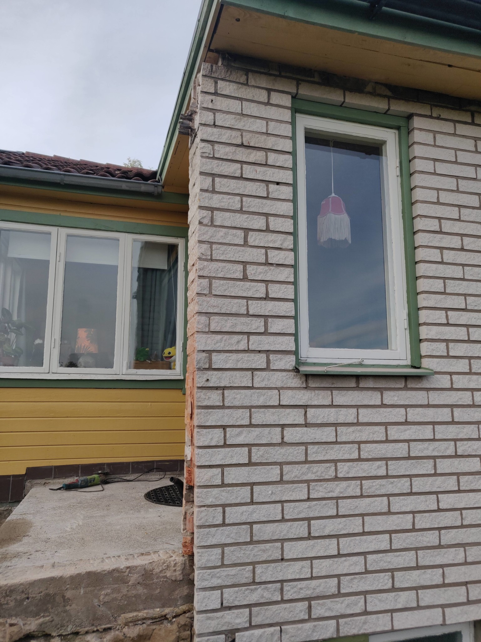 Oro uppstår då med fasad av mexi.. den är även den ett orosmoment från första början. Nu sparade jag ett hörn där det är murat med viss förband och i vinkel. Skulle trapp bilas kanske mur försvagas och sprickbildning. Skulle man kapa ytterligare på mur och få bort det som är byggt i trapp blir lite klent med tegel kvar kring fönster.