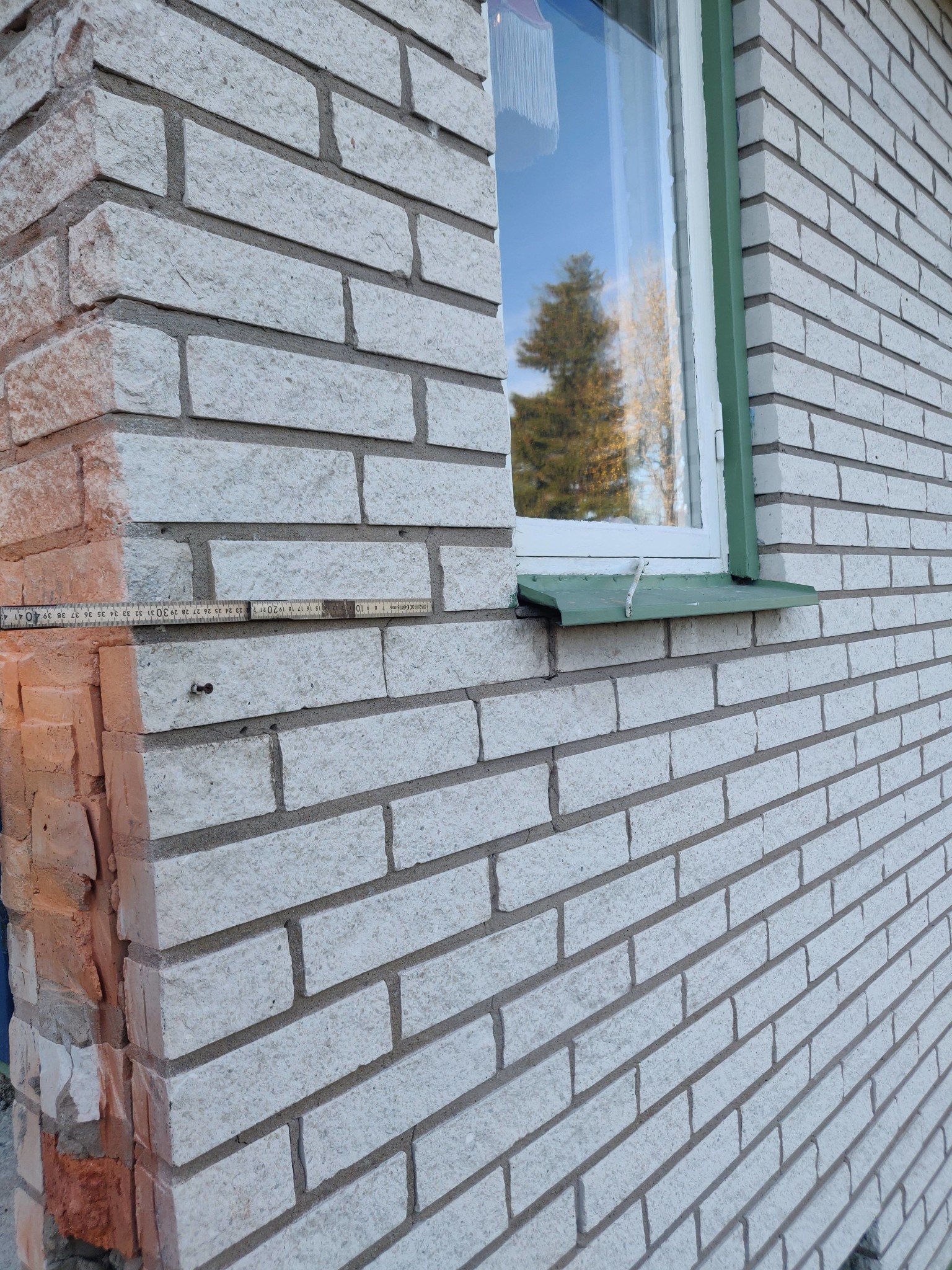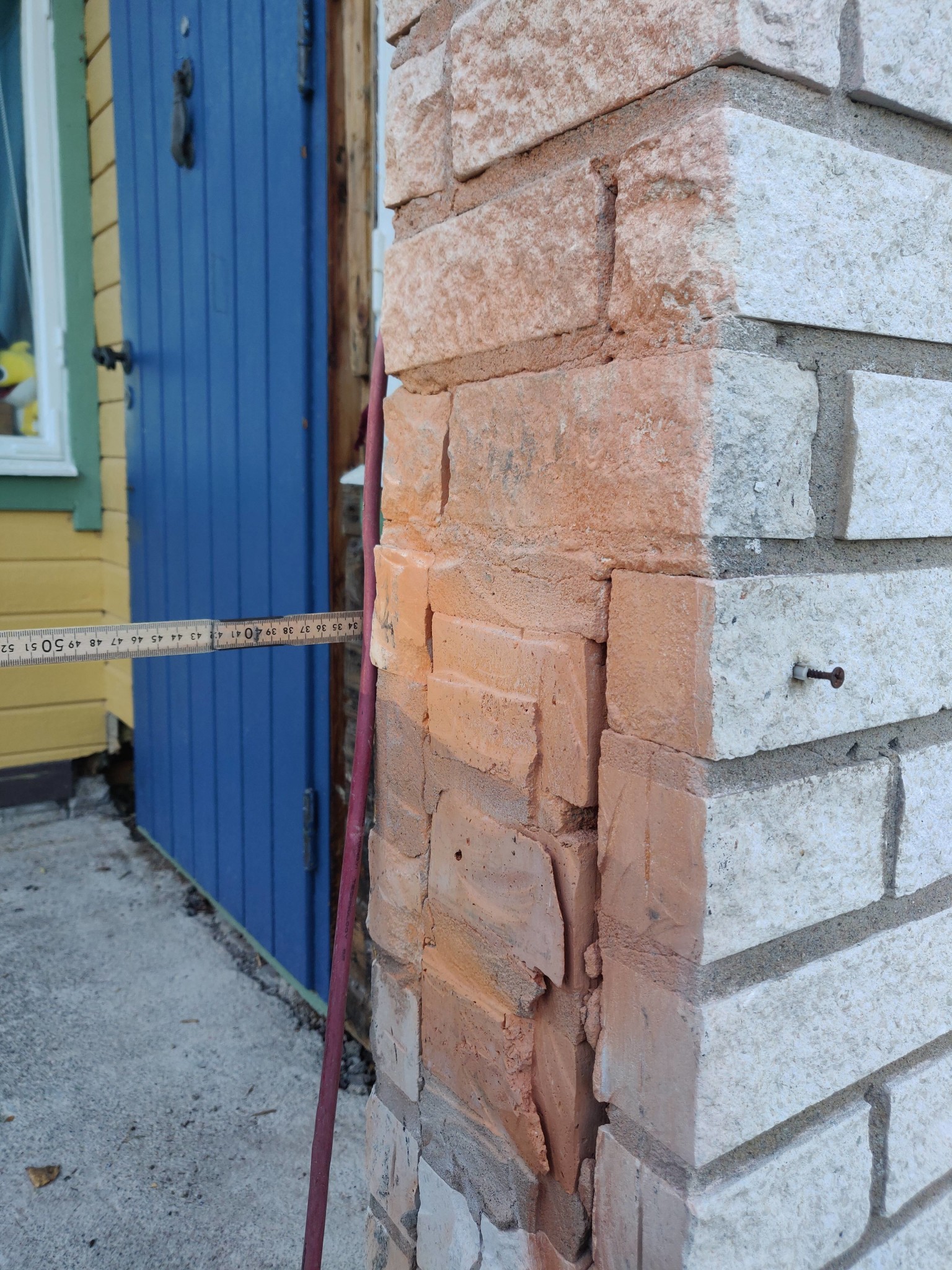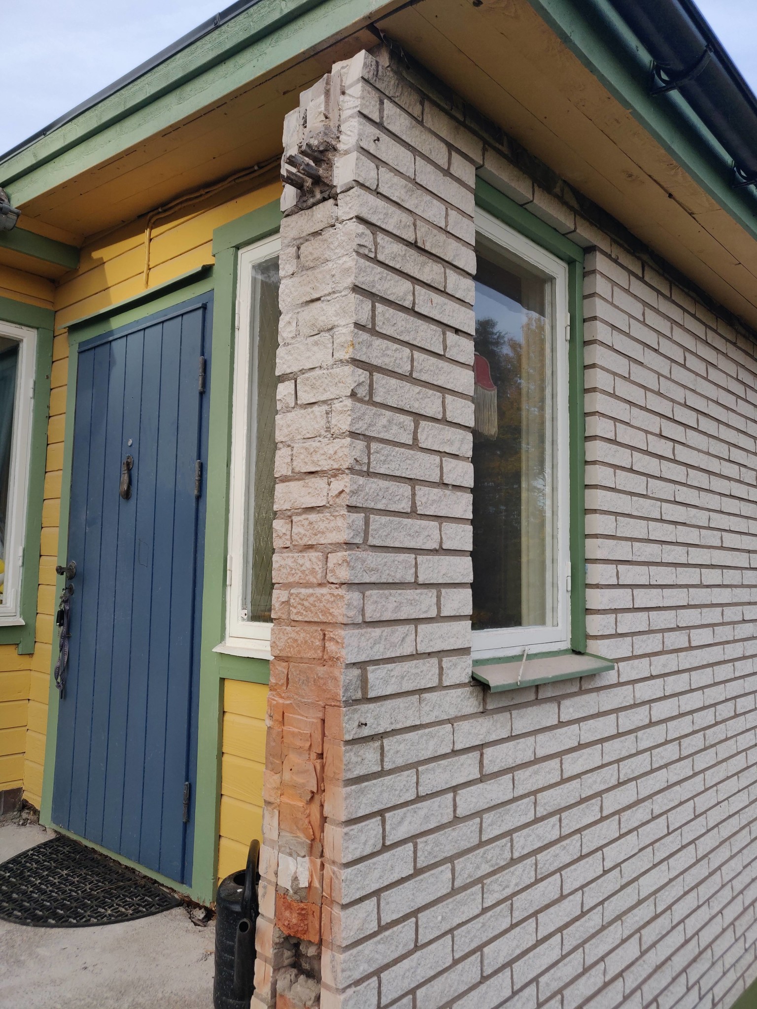 Oro uppstår då med fasad av mexi.. den är även den ett orosmoment från första början. Nu sparade jag ett hörn där det är murat med viss förband och i vinkel. Skulle trapp bilas kanske mur försvagas och sprickbildning. Skulle man kapa ytterligare på mur och få bort det som är byggt i trapp blir lite klent med tegel kvar kring fönster.