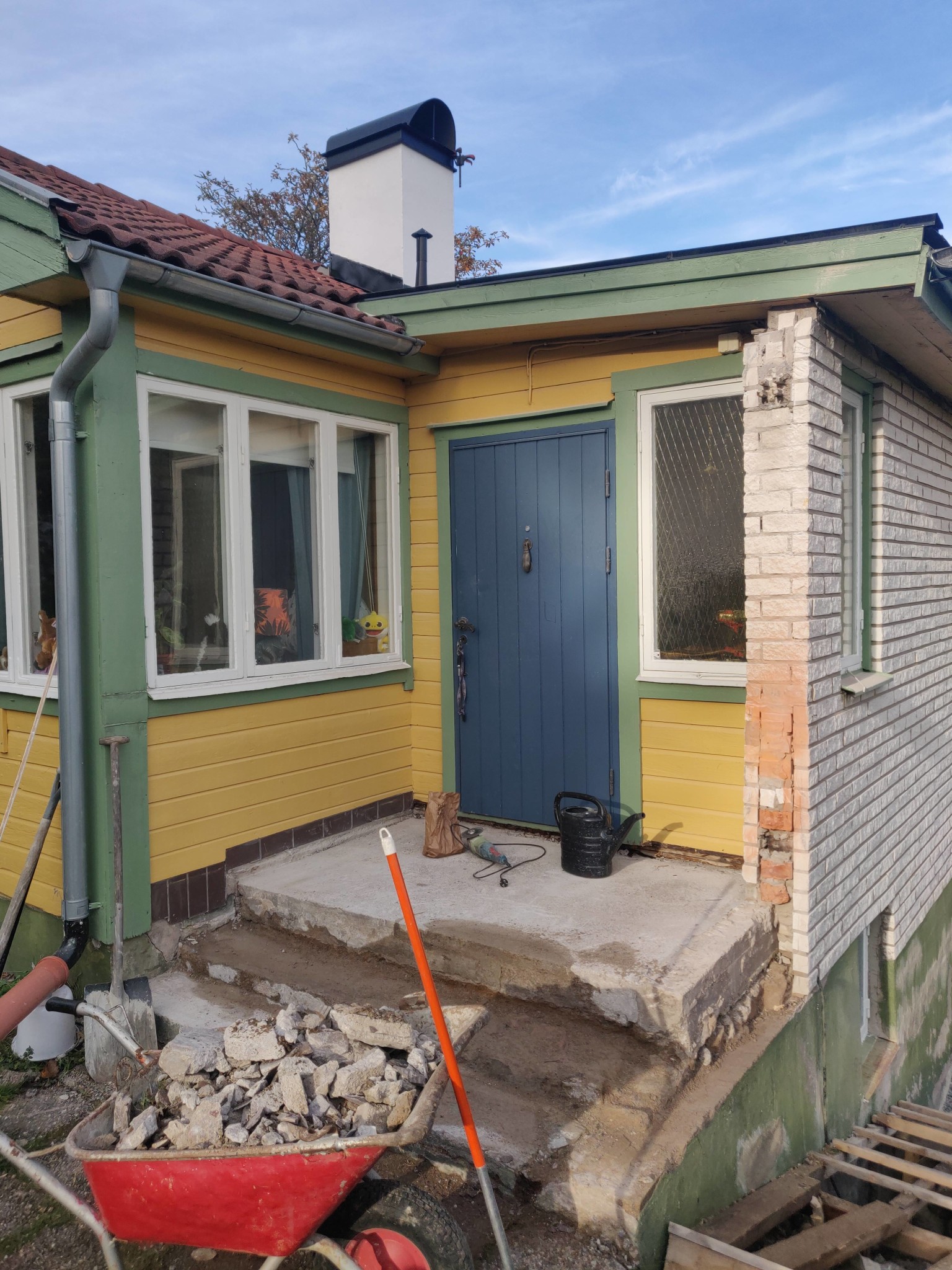 Då kom trappan fram och nästa problem uppdagades. Trappa pågjuten samt med klinker som går in ca 2cm i ytterfasad. När det bilades bort är ju såklart trä slut bakom då vatten runnit bakvägen in.