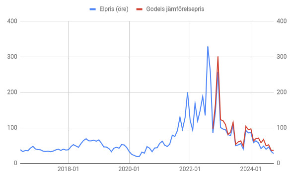 Blå är vad jag betalat, röd är vad elbolagets snittpris varit sedan vi skaffade timdebitering.