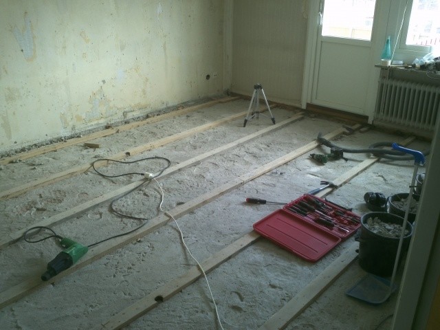 Jag behöll reglarna, jämnade av med elhyvel och bandslip. Det tog ganska lång tid men resultatet blev helt ok. Dessutom blev jag tvungen att bila bort betongslagg längs hörnen för att det inte skulle sticka upp över nivån för reglarna. Isolerade med 30mm "ljudskiva" mellan reglarna och la 22mm spånskiva på.