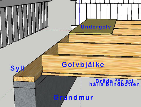 Bifogar en bild som visar hur golvbjälkarna möter syll och grundmur.