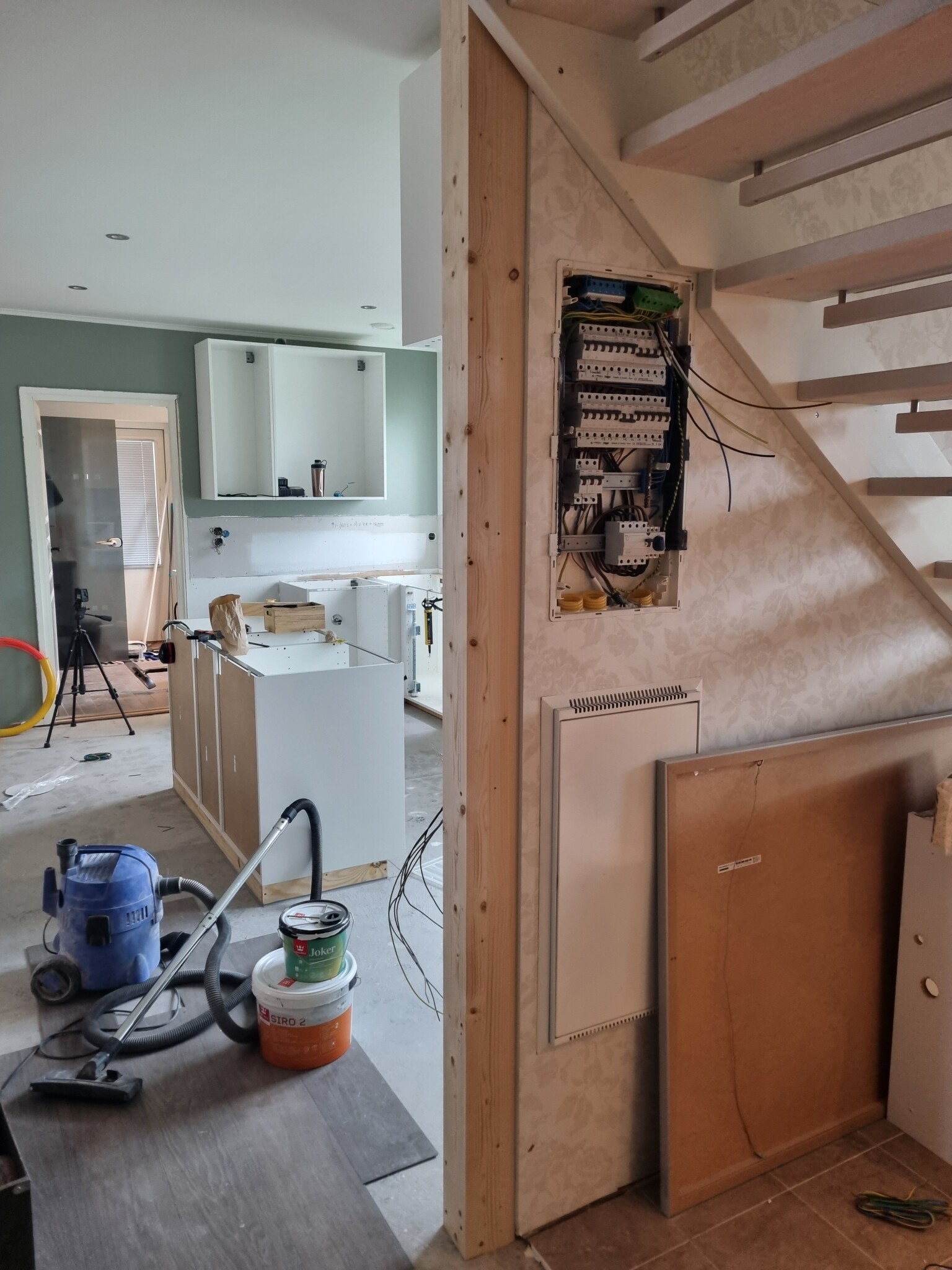 Högskåpet kan "svaja"/gunga lite i toppen, bara för att inte högskåpet ska riskera välta om mer än hälften av inbyggnadslådorna dras ut samtidigt samt för att få fin baksida så har vi satt täcksidor som går ända upp till taket.