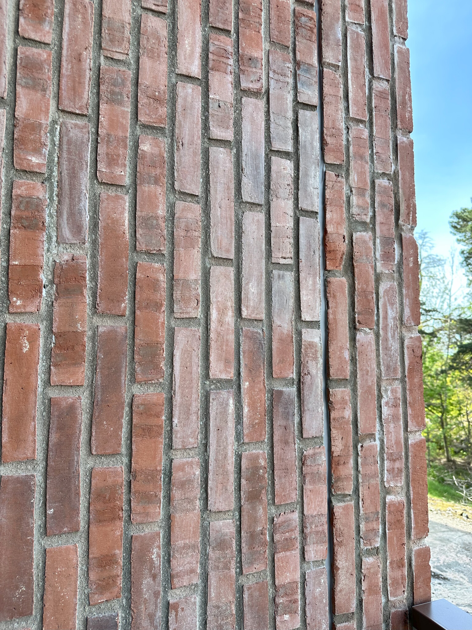 • Röd tegelvägg utomhus på en balkong med träd i bakgrunden, lämpad för ljusslingekrokar med minimal åverkan.