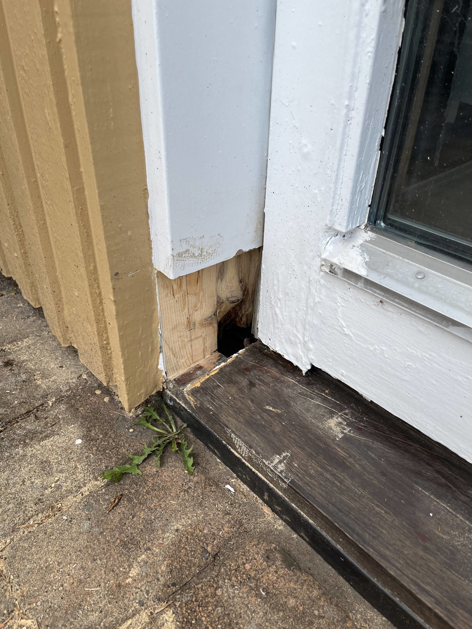 har haft en bit murket trä som gått djupt i en regel till en skjutdörr. Tagit bort det murkna och ska fästa en ny bit.