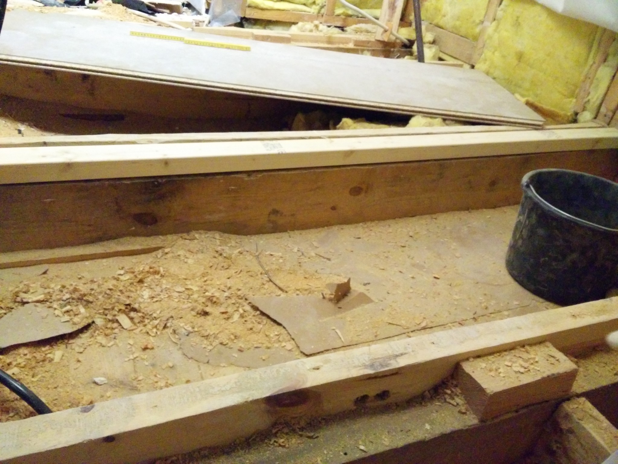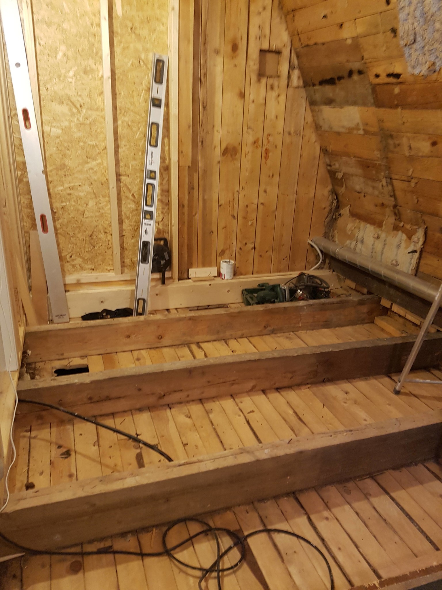 Jag har även hittat innerväggen och kan se stående plank. Finns även en regel mellan några golvreglar vid upplaget då det är en något bredare dörröppning på våningen under.