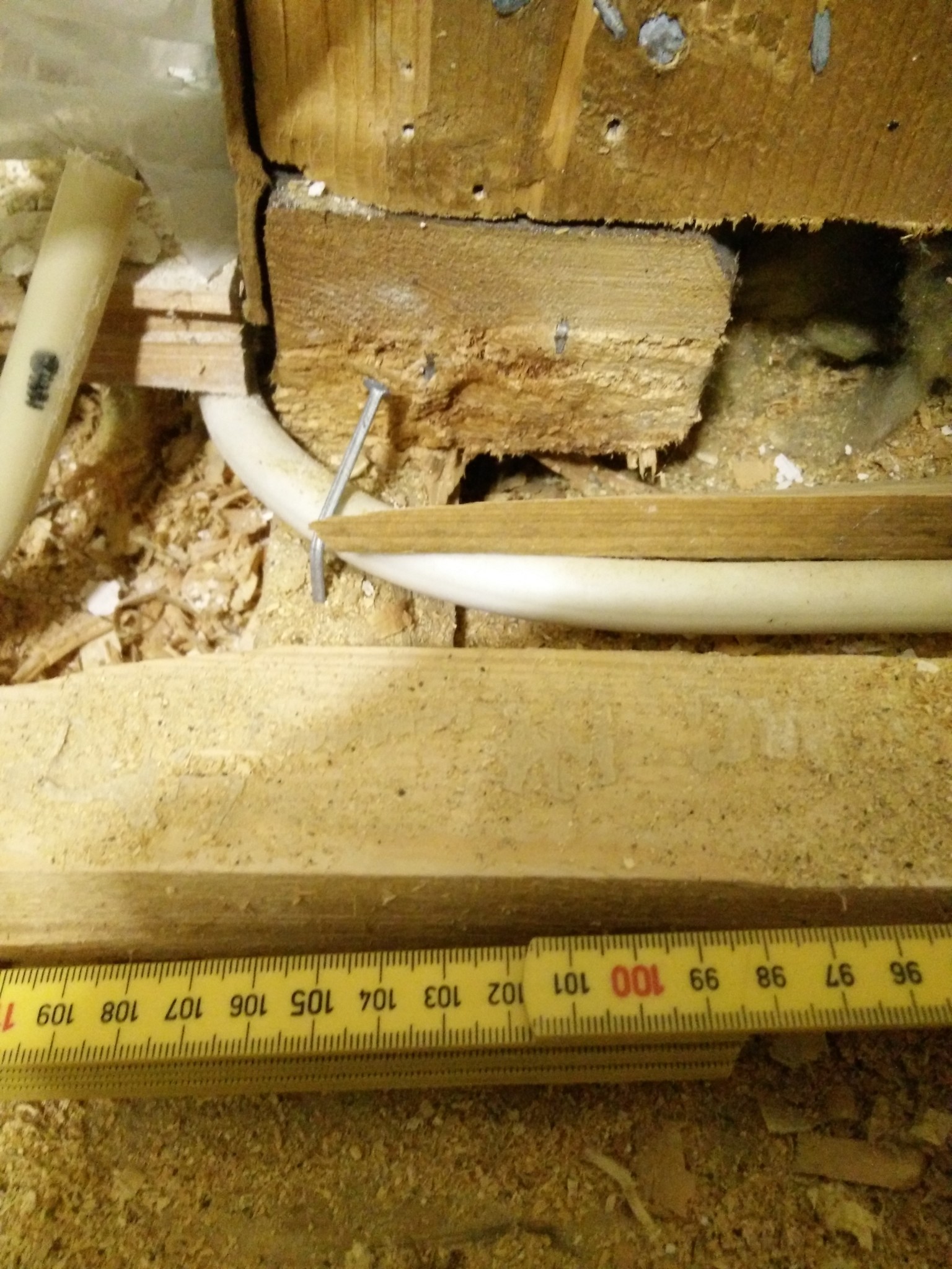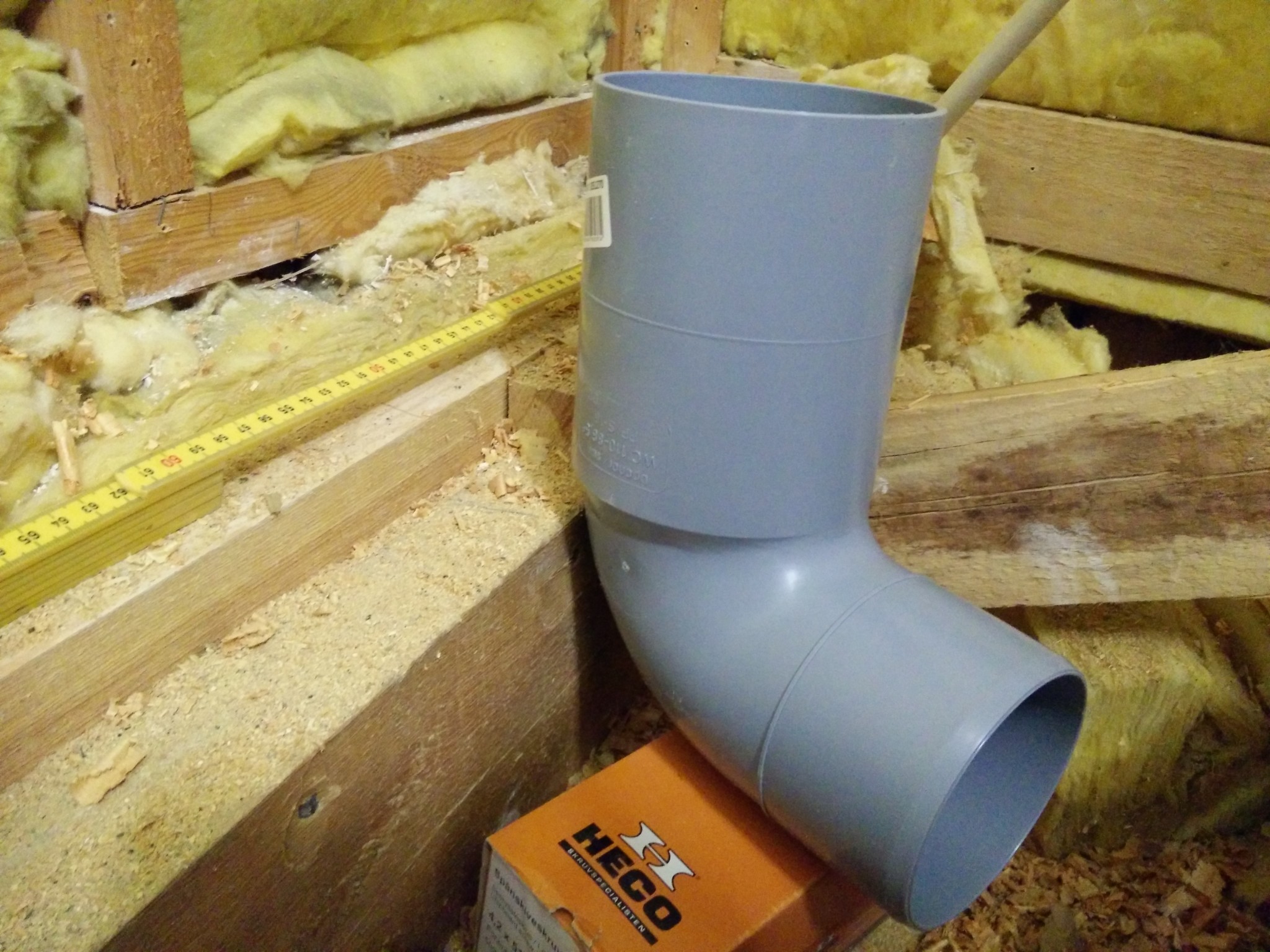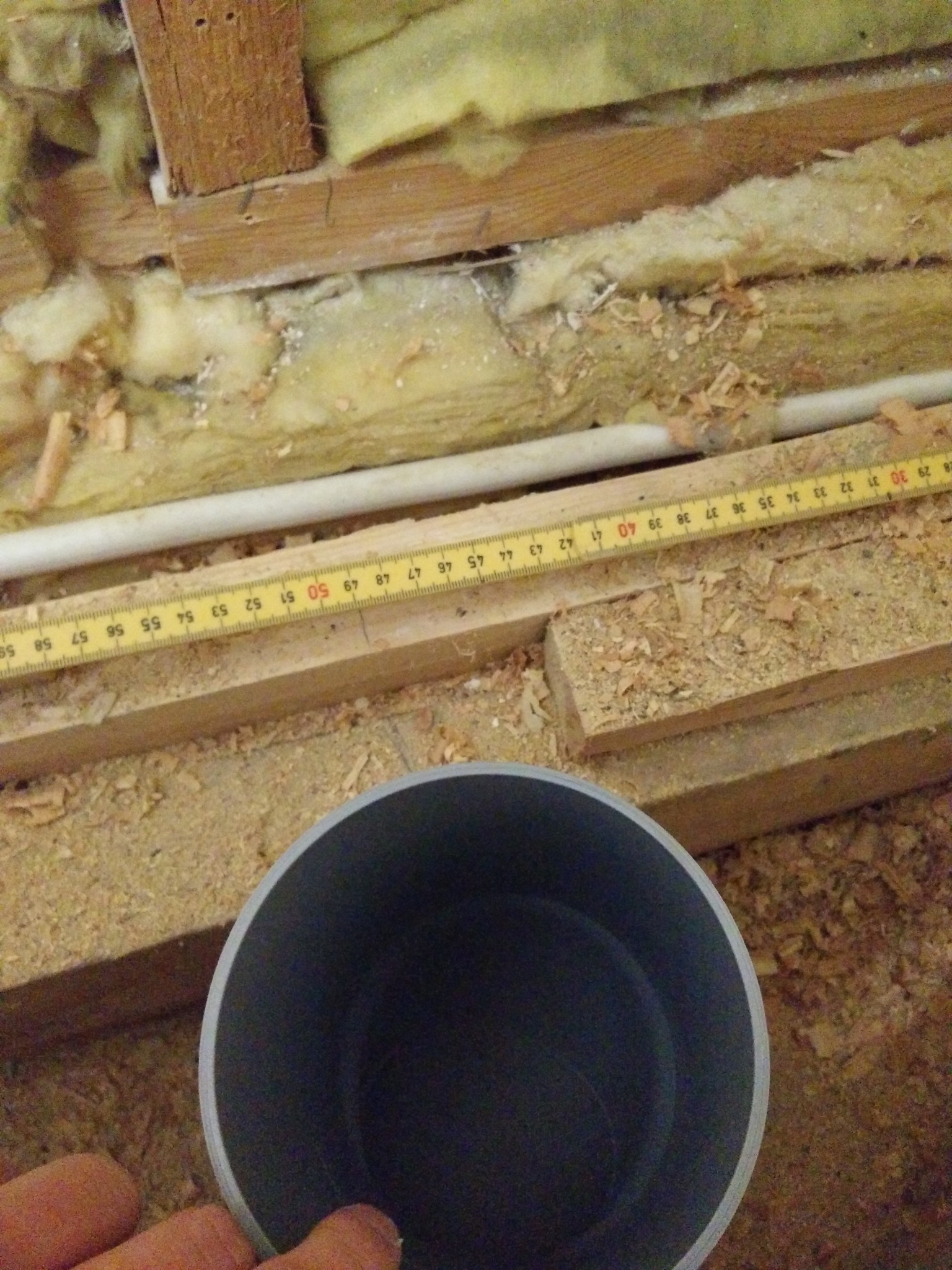 Övriga genomföringar (endast 75mm avloppsrör som måste korsa bjälklaget) tänkte jag limskruva 15mm k-plywood på ca 80-90cm. (Inspirerad av mallen från säker vatten som är beskriven för 110-rör).