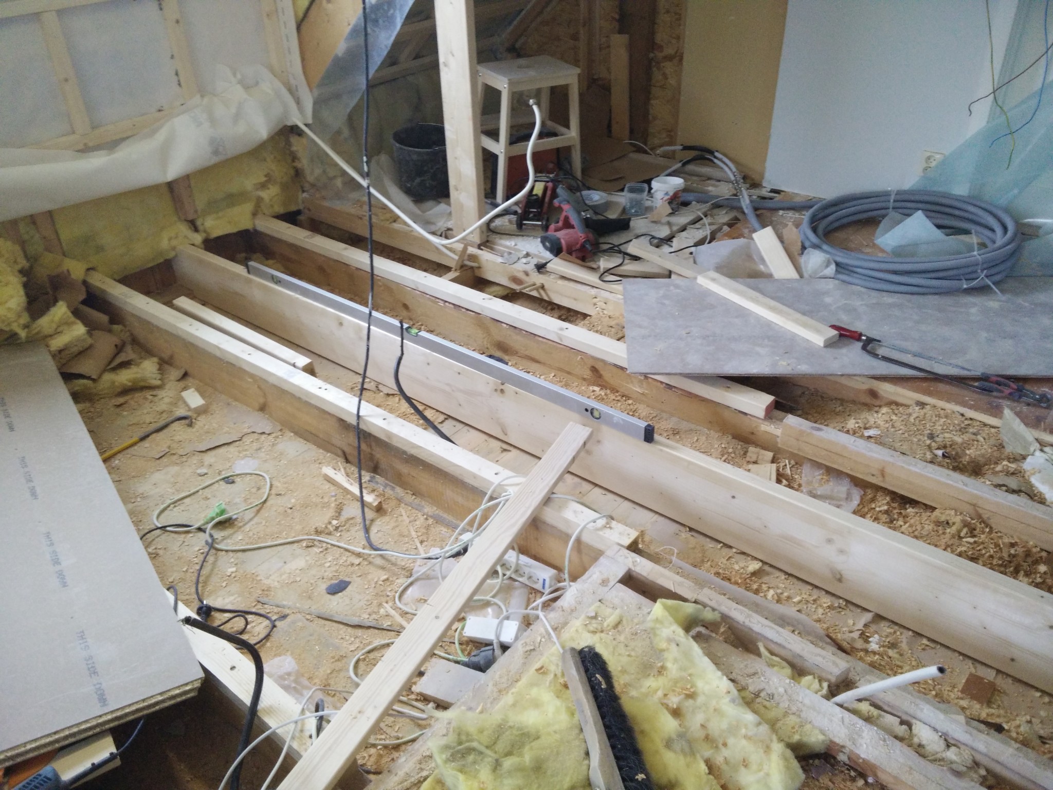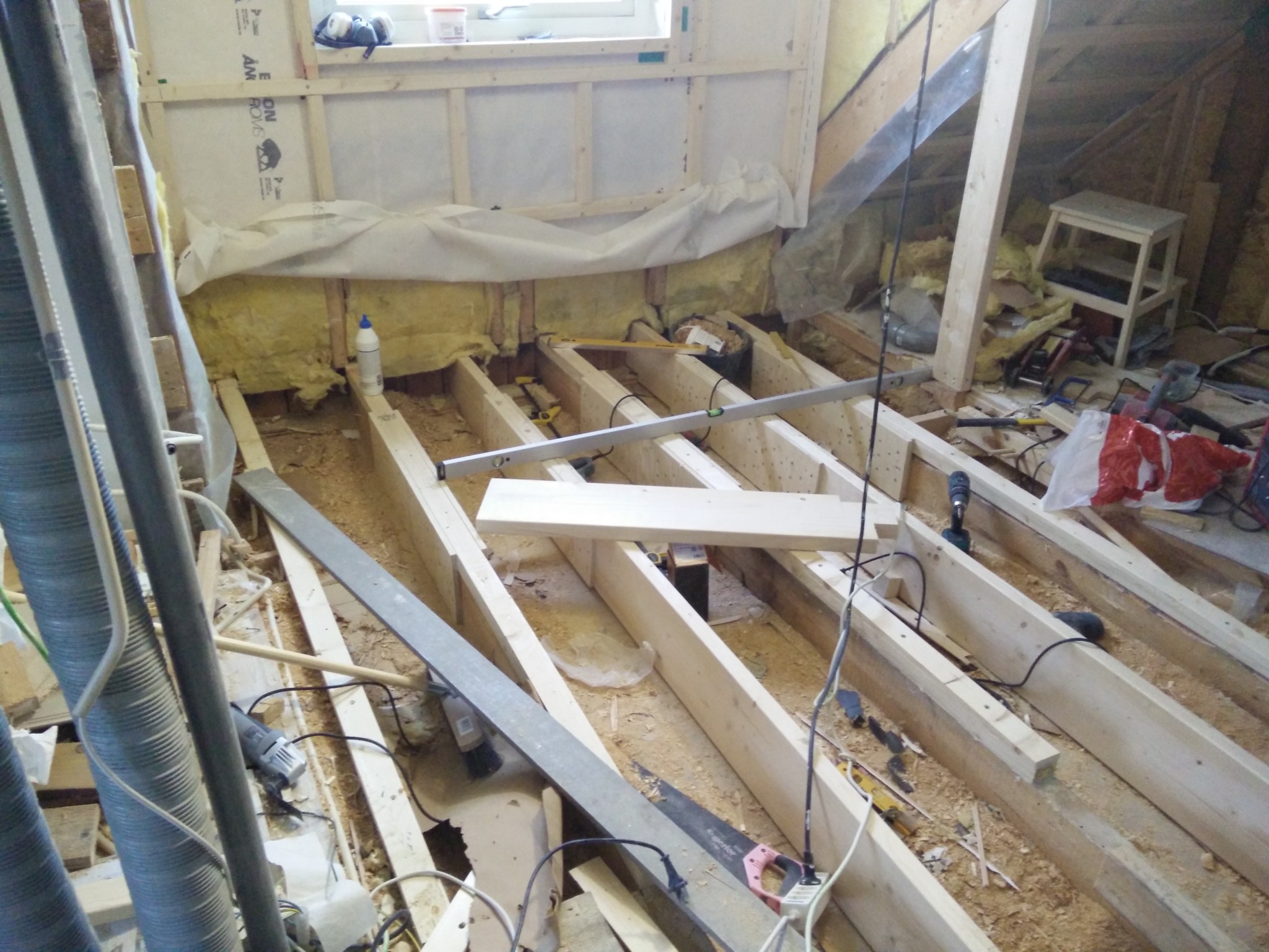 Nu har jag kommit såpass långt att spånet håller på att komma på plats inne i badrummet. Jag tycker förstärkningarna kändes stabila och kortlingar under badrummets vägg (som råkar vara vid halva spännvidden) stuvade upp en del också.