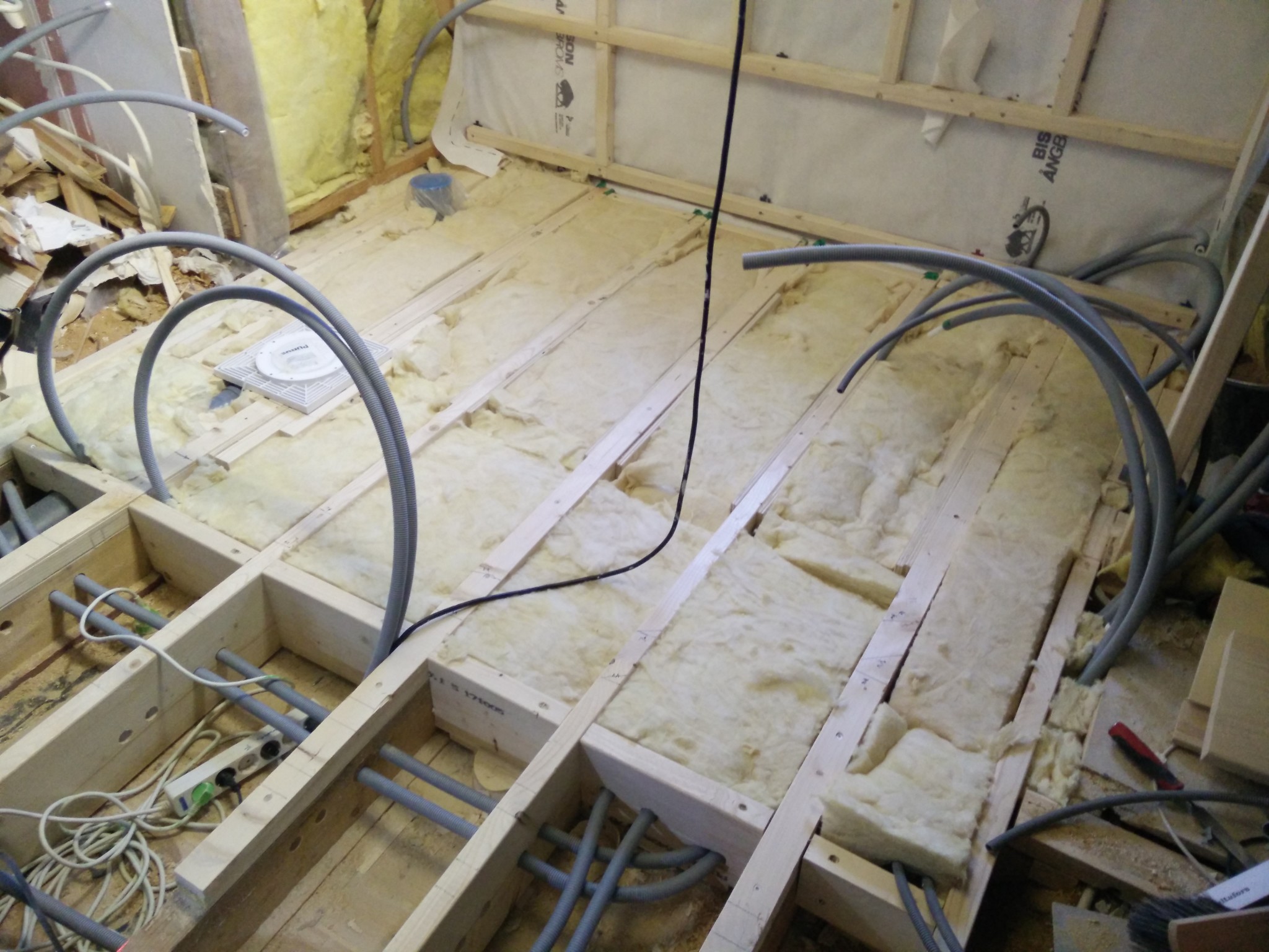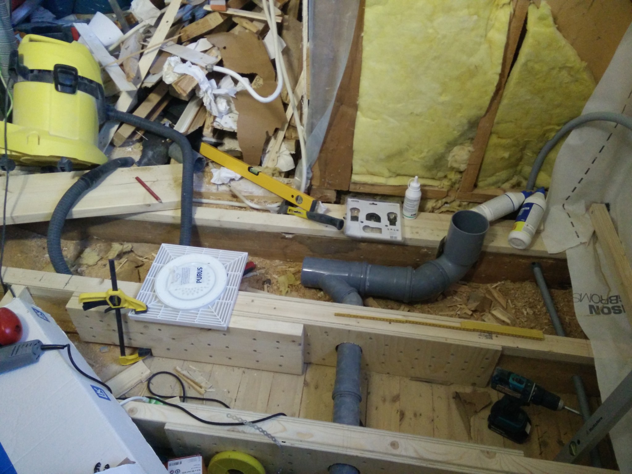 Ska borra genom sista bjälken och montera avloppet samt förborra lite för RiR som ska gå i bjälklaget när det är lite extra plats.