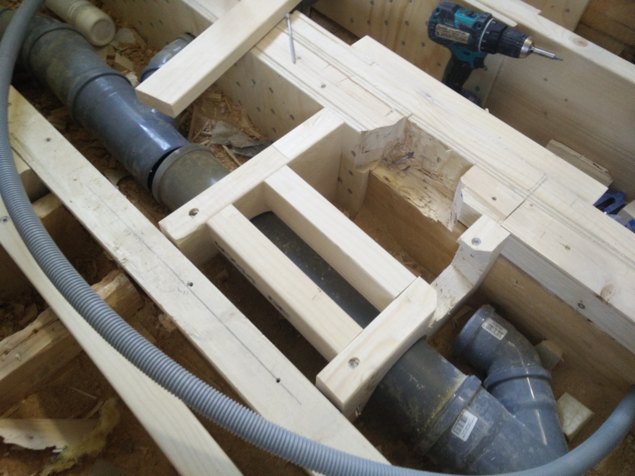 De nya bjälkarna fixeras först när jag har borrat genom dem och stuckit igenom ett 75mm avloppsrör.