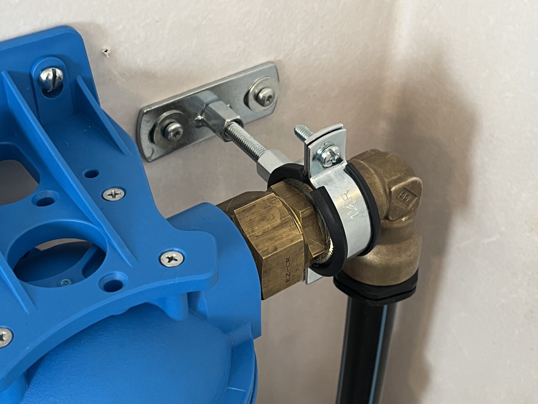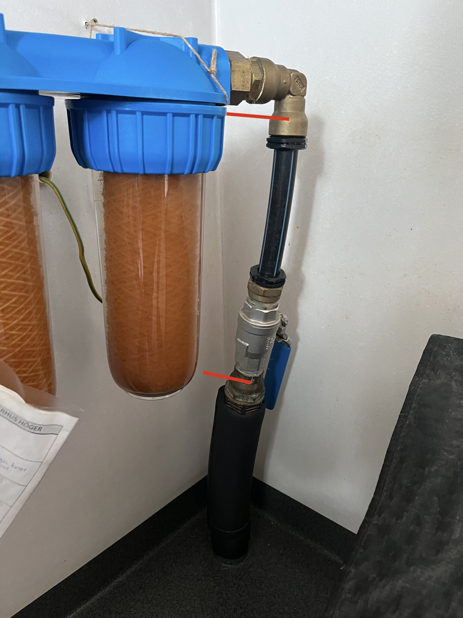 Min mor har egen brunn och en PEM slang som kommer in från hydropressen i garaget. Det har sett ut så här sedan hon flyttade in men nu har jag bytt vattenfilterhus och skulle behöva fästa rören/kopplingarna mot väggen på något sätt så att det sitter stabilt och inte spänner.