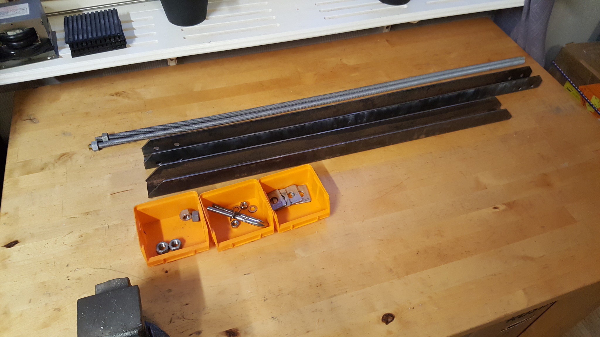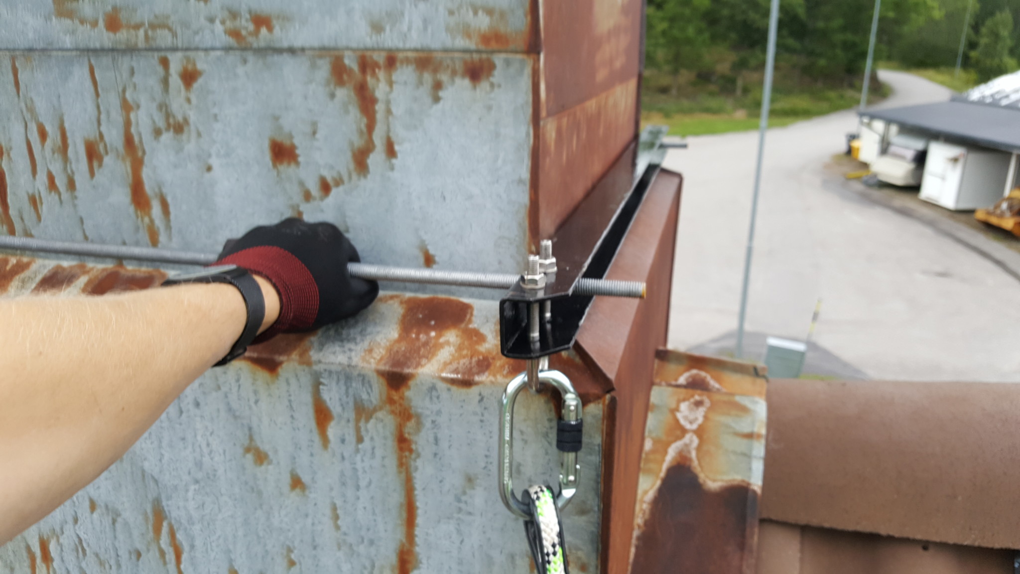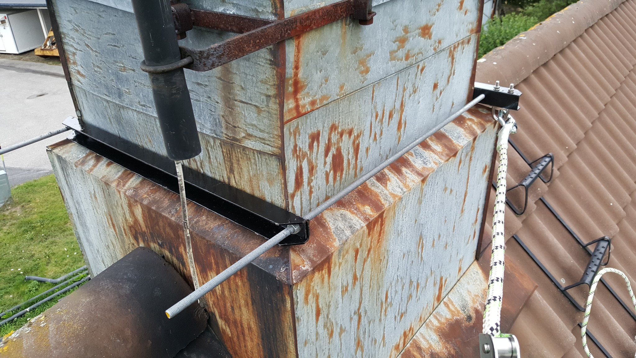 Två U-balkar i stål som kläms kring skorstenen med en M12-gängstång. Och en ögla i rostfritt stål i den ena U-balken där man hakar fast säkerhetslinan (det ska bli två öglor, en på varje sida, så jag har förbrett med hål för en ögla till).