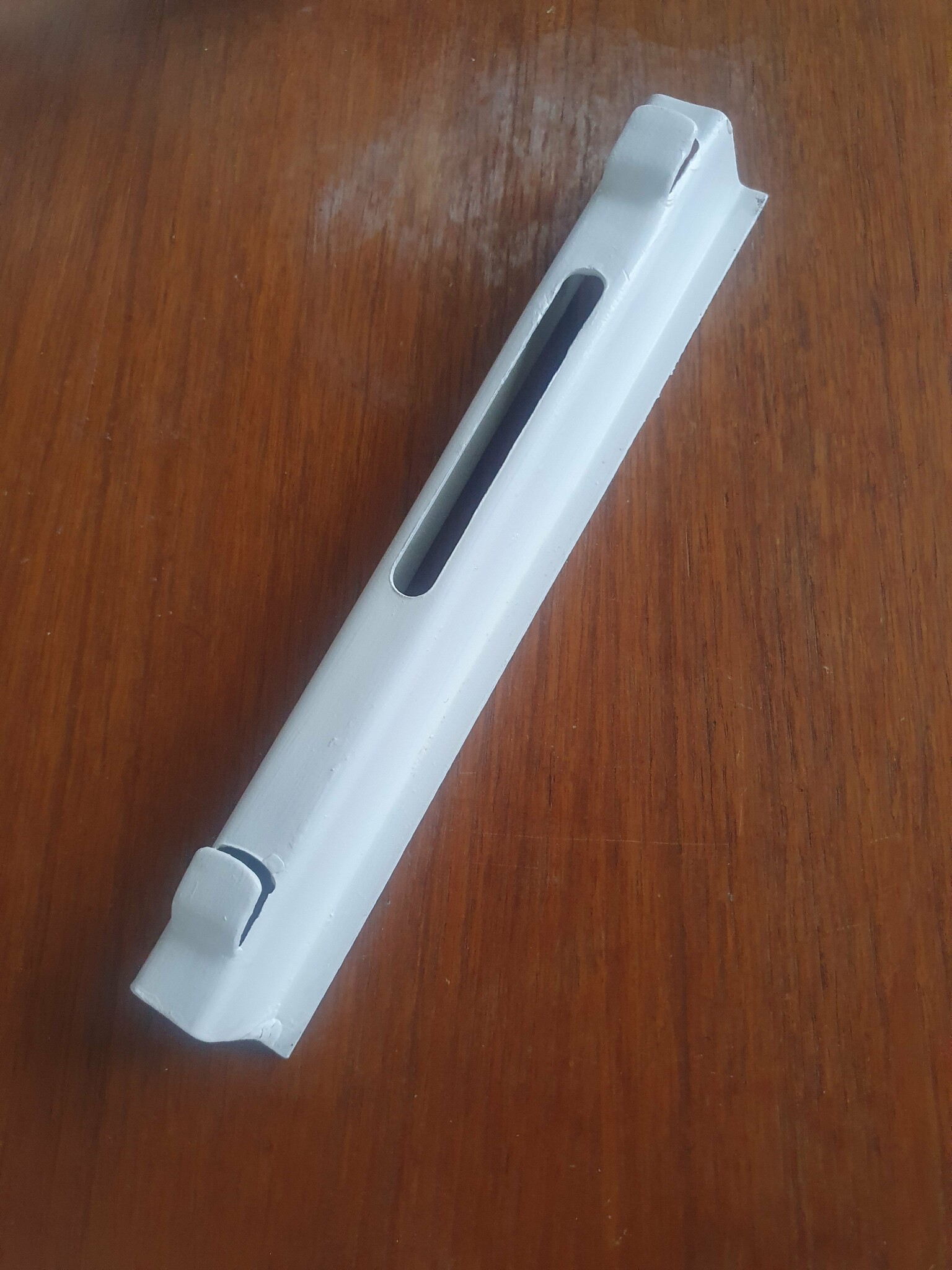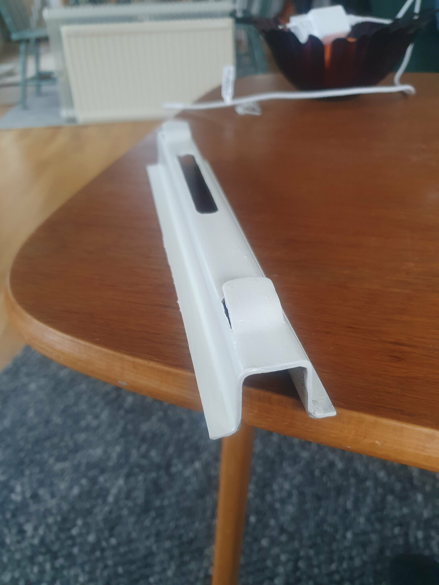 Vi är lite fundersamma hur vi ska fästa detta i väggen på ett bra sätt. Det enda stället man kan fästa något i är skåran mitt på, men då hamnar skruvhuvudet ca 2,5 cm från väggen pga fästets profil vilket känns som det blr vara ganska påfrestande för skruven. Någon som vet hur det ska göras? Eller saknar vi rent av en del av fästet?