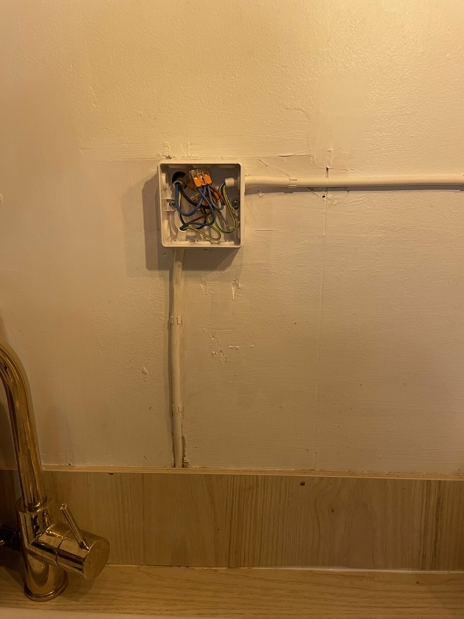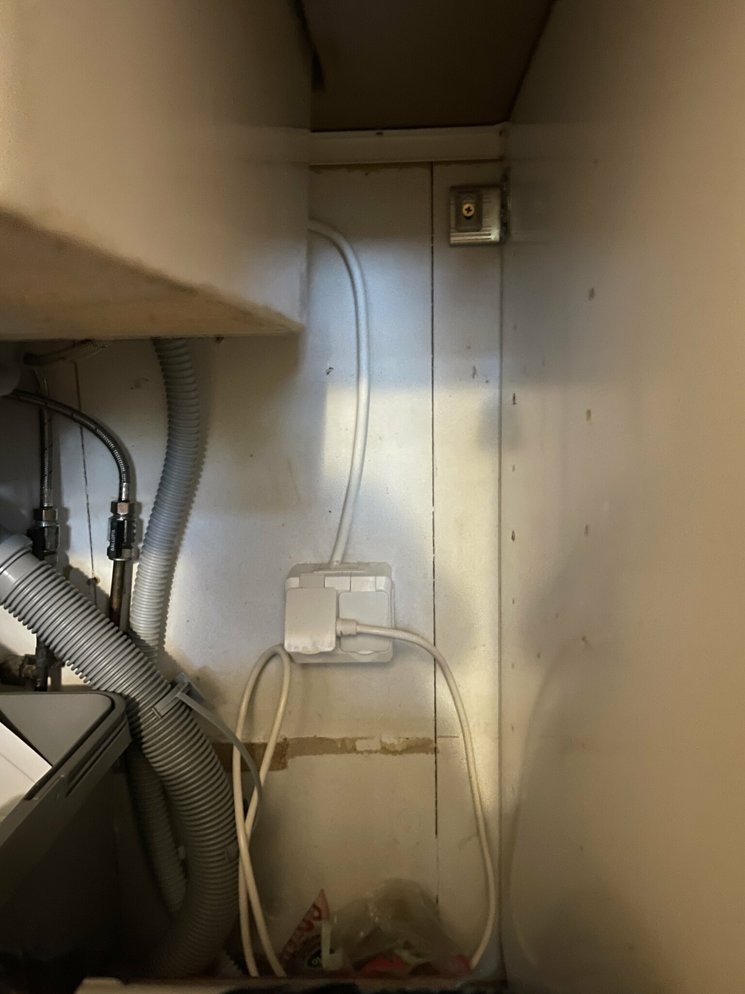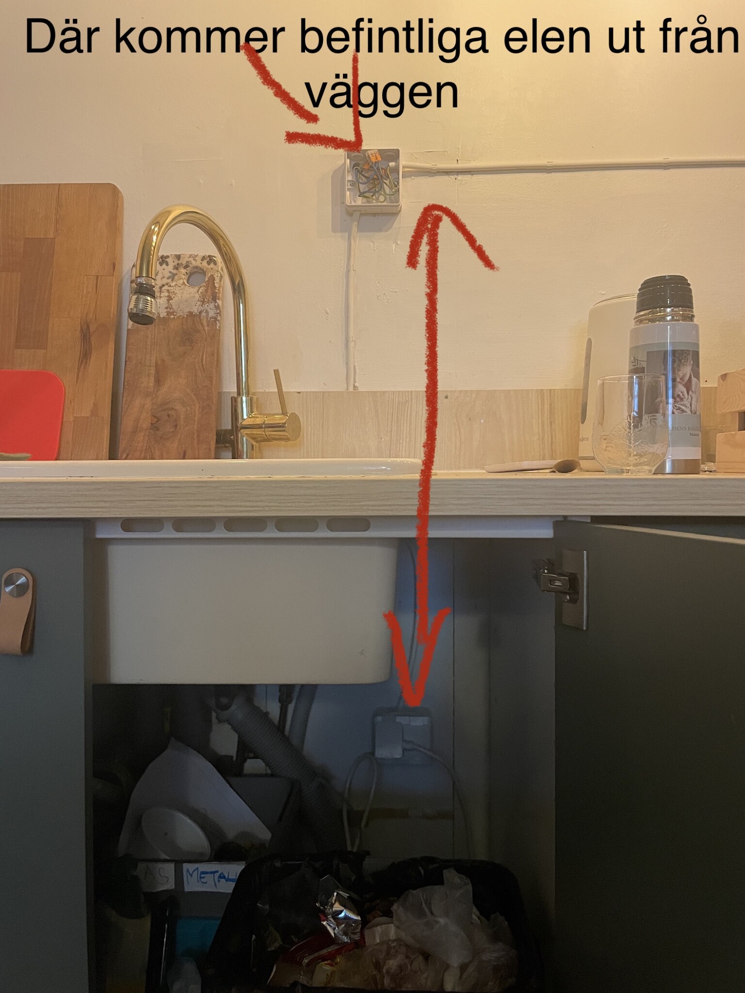 Det handlar ungefär om 1m slang/rör som behövs. Elen ska alltså bakom diskbänken se bild! Och jag ska inte ha något mer uttag på denna vägg då det redan finns på andra väggen.