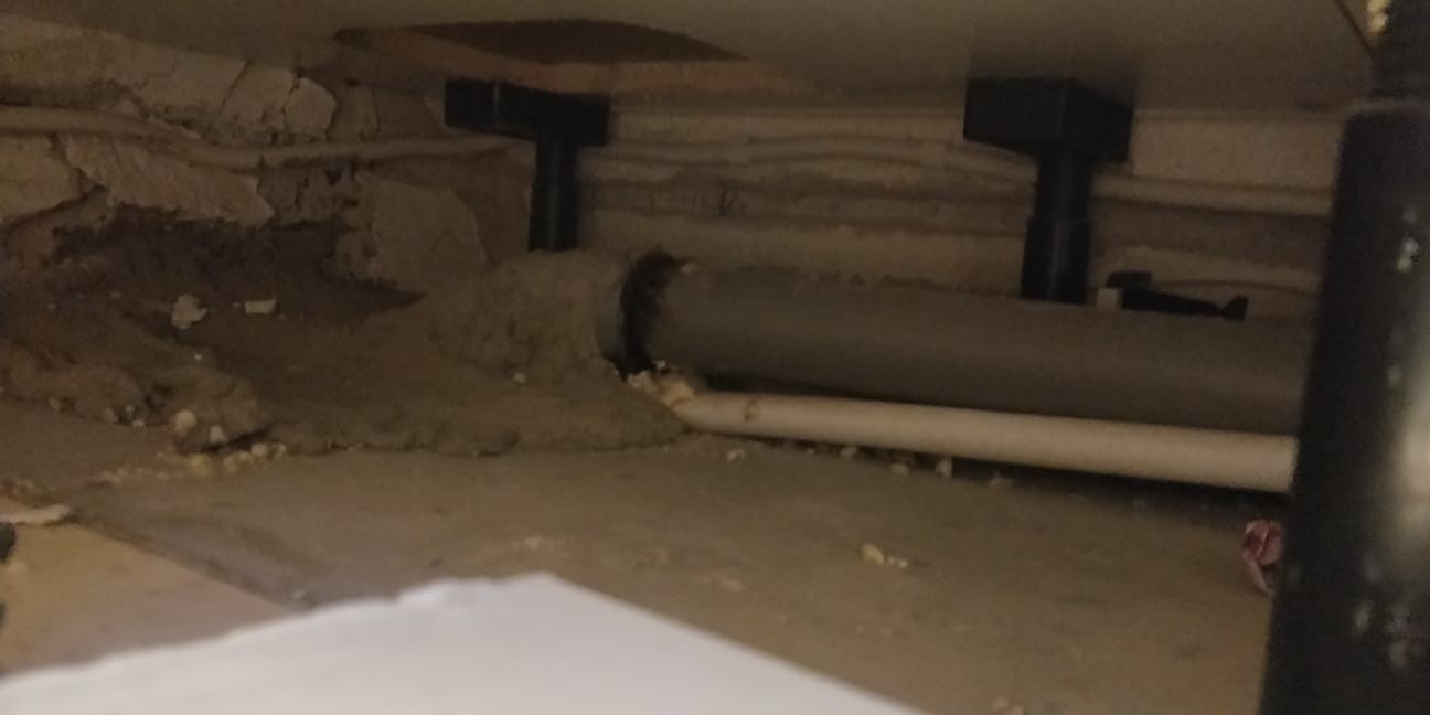 La mig på golvet och tog bort sockeln för att se vad som fanns under skåpen och såg då att avloppet ser ut som på bilden. Kan ingenting alls om avlopp, men det känns svårt att ansluta ett nytt utan att bila upp golvet. Ska det se ut så här?