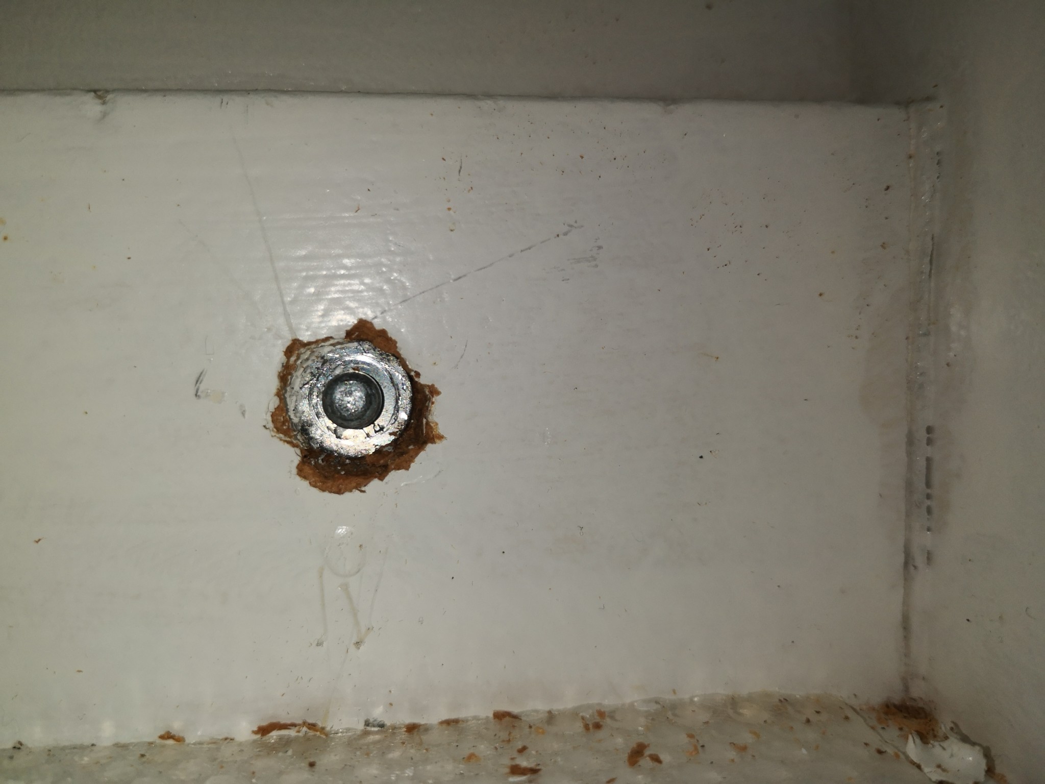 Jag ska renovera mitt kök från 70 talet och har märkt att en av skåpen är fastmonterat mot väggen med det som finns i nedanstående bild.