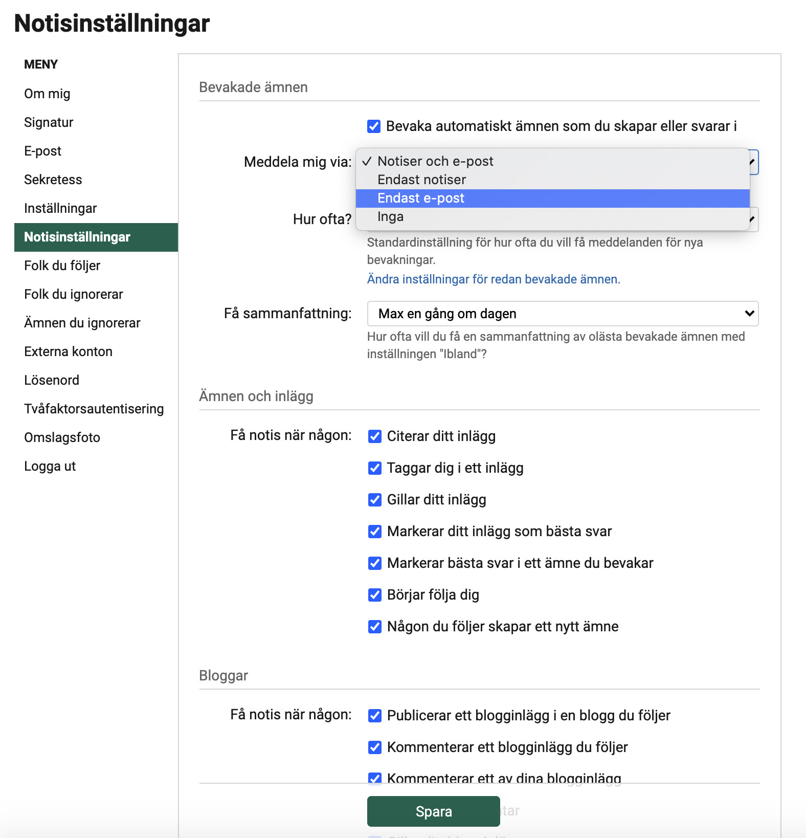 Antingen så ändrar du Meddela mig via: från "notiser och e-post" till "Endast e-post" eller "Inga".