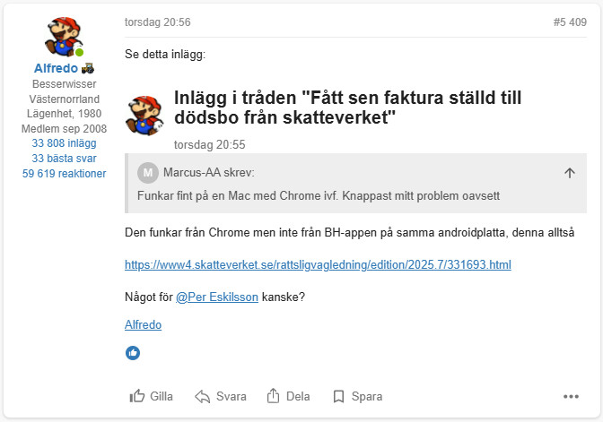 Så där ser det ut för mig nu när man länkar till ett annat inlägg inom forumet. Dock ser man inte vad som är länken och vanligt inlägg. Därför önskade jag iaf en tunn ram eller något som gör att man ser att det är en länk till ett inlägg.Per Eskilsson skrev: