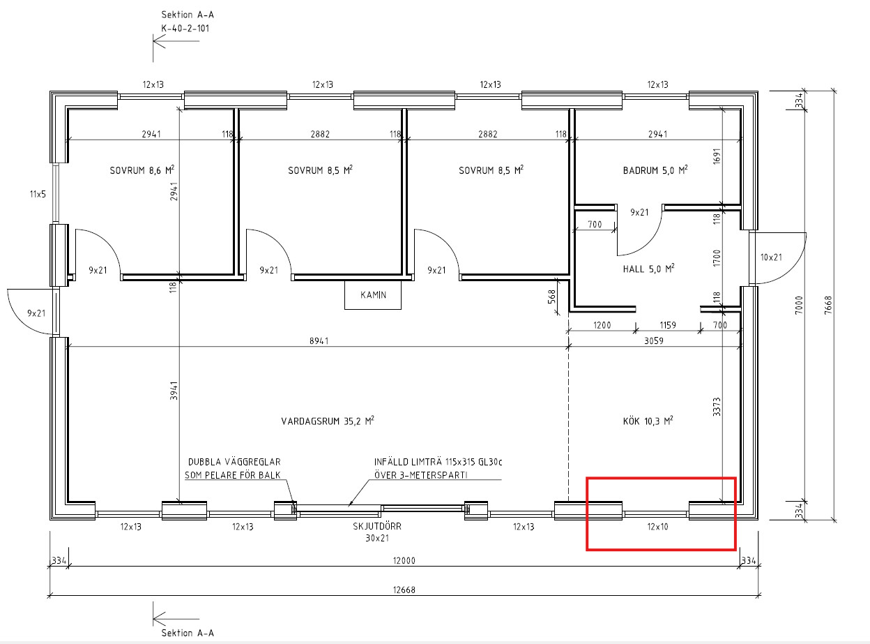 En sak jag funderar en hel del på är det inringade fönstret. Tanken med att sätta ett 12x10 är att få plats med en bänkskiva under fönstret för att få tillräckligt med yta, men jag funderar på om det kommer bli fult när det fönstret inte är linjerat med övriga på den fasaden. Vad säger ni? Hur viktigt är det att alla fönster är linjerade i nederkant?