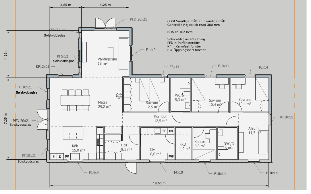 Det är ett väldigt smalt fönster i föräldrasovrummet. Frågan är om det är tillåtet med tanke på att fönster väl ska kunna användas som utrymningsväg eller sätt för räddningstjänsten för att komma in och få ut avsvimmade personer. Fundera på att vrida sägen så att huvudänden är mot badrummet (dörren flyttas) eller mot matsalen med garderoberna mot badrummet. Kan väl vara trevligt att kunna se ut när man vaknar.I ixob skrev:Bra synpunkt, det hade vi inte riktigt tänkt på.