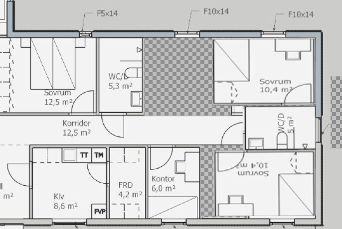 Frd mellan barnrummen får jag inte ihop ingångar till rummen på med bredden av huset.