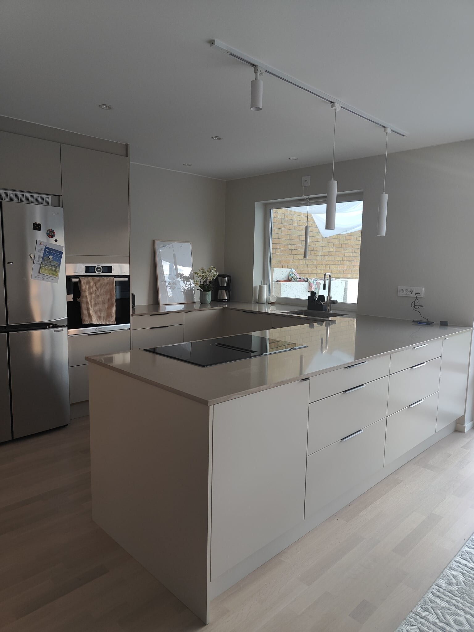 Gällande köket så hade jag övervägt att ha en halvö istället. Köksö är förvisso trevligt, men det är tar mycket yta. Med en halvö och bänkskiva under fönstret så får ni gott om arbetsyta. Om ni då även har kyl/frys/ugn mot ytterväggen så kan ni få till en riktigt bra arbetstriangel, och vill man ha barstolar el liknande så är det i sig inget bekymmer.