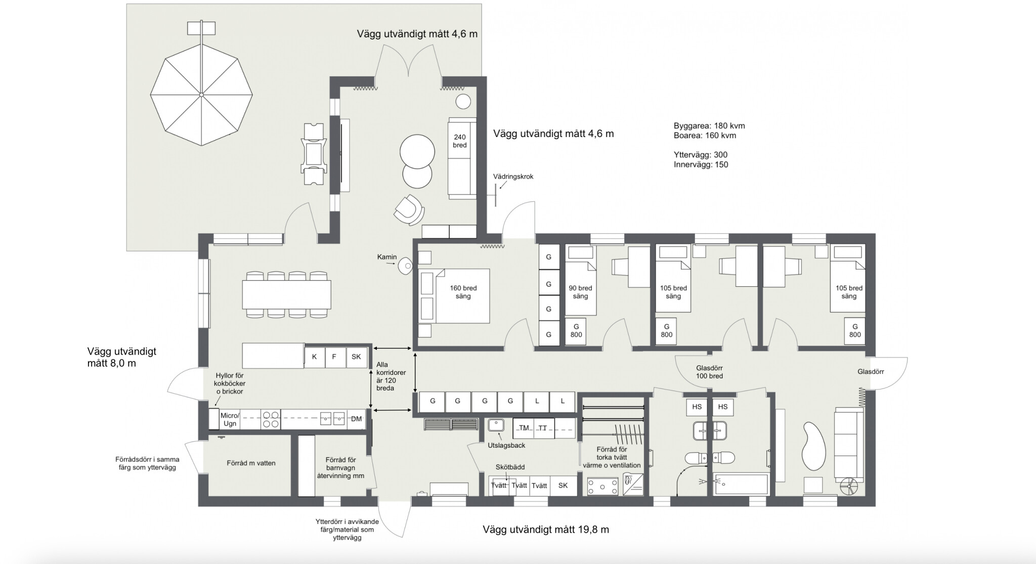 Observera att föräldrarsovrummets mått stämmer med minsta mått för tillgänglighet i öppen golvyta men att sängen egentligen ska placeras huvudändan mot ytterväggen. För att få till ett fönster eller i detta fall en glasdörr lekte jag med tanken att möblera om med en 160 bred säng.