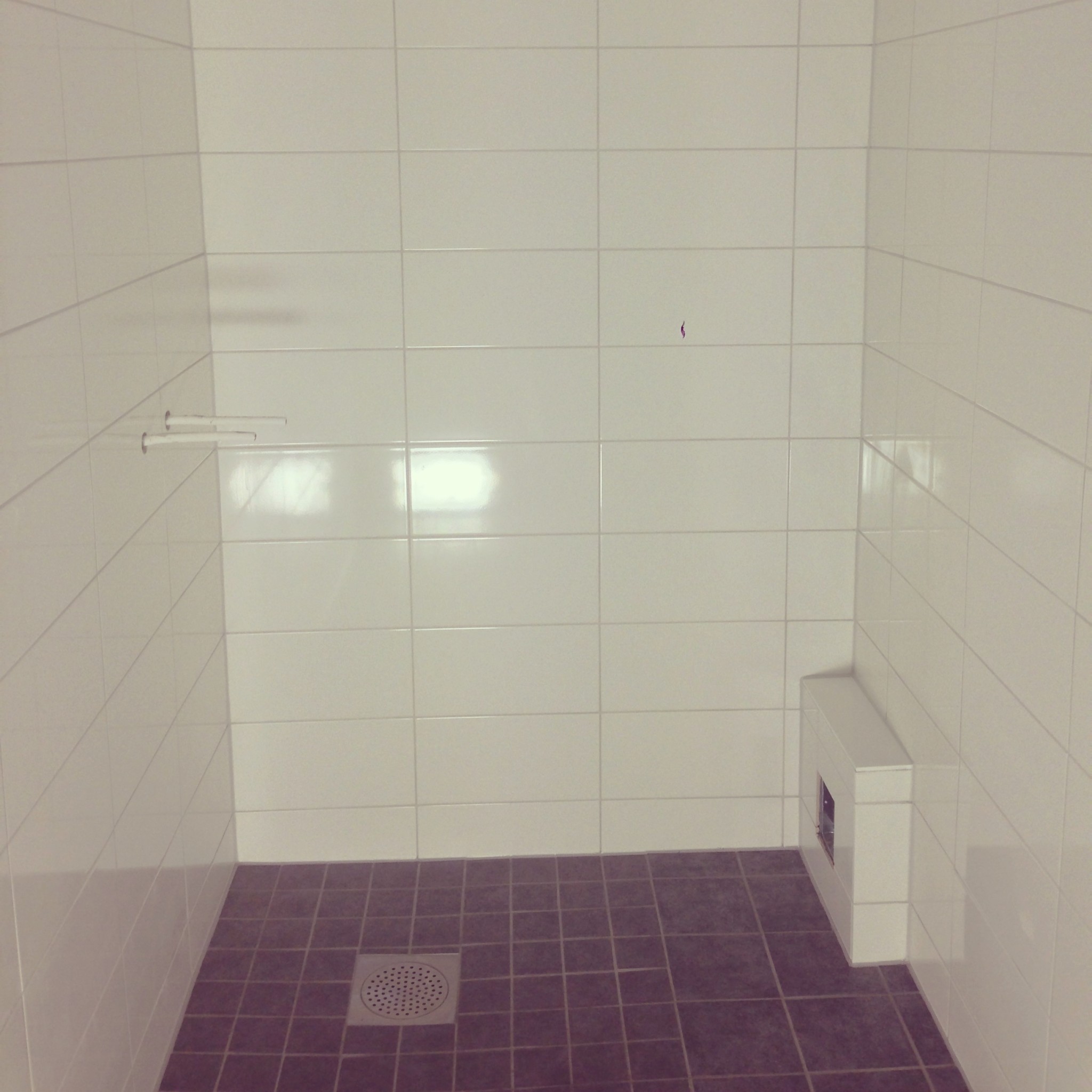 Redan efter att jobbet var klart, så uppmärksammade jag att fallet på golvet var felaktigt vid duschen, då vatten rann rakt ut på golvet och rann inte tillbaka.