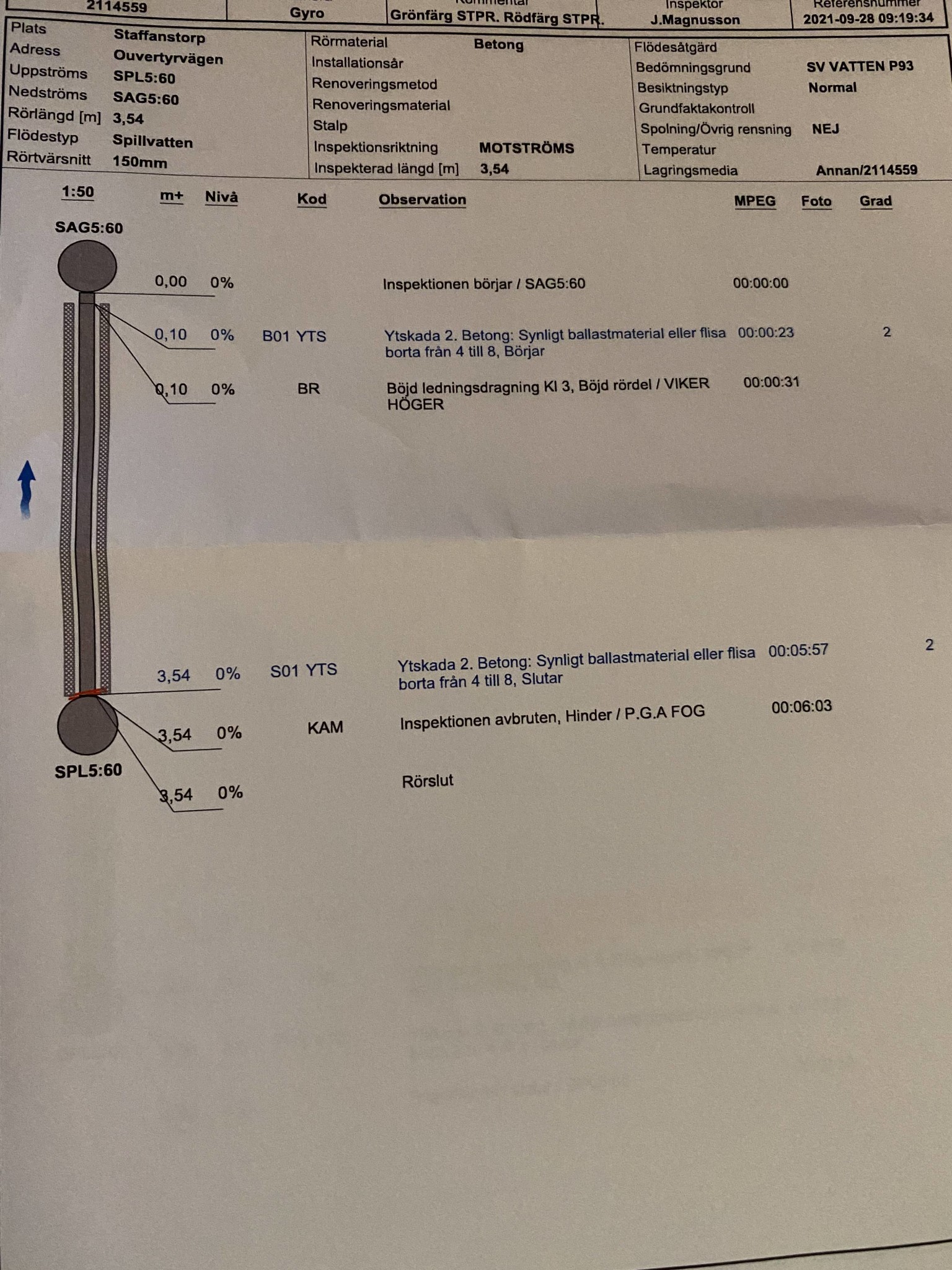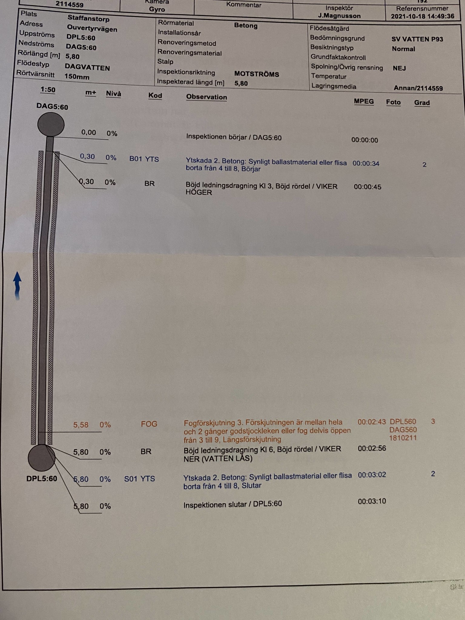 här kommer protokollet som för mig är rena grekiskan…S sepani skrev:Idag väntade en otrevlig överraskning från kommunen i form av ett brev från Ramboll som de engagerat för att på något sätt undersöka inläckage av "otillåtet" eller "ovidkommande" vatten i spillvattensystemet. Vi bor i ett hus från 1974. Jag tror (?) att vårt dagvatten är kopplat via vår avloppsbrunn som ligger inne på tomten. Kan det vara detta som de nu menar är fel, eller vad kan det vara som de upptäckt? I brevet hävdas det att det står vad jag som fastighetsägare måste vidta för åtgärder, men jag begriper det inte...det pratas om möjlighet att koppla på det kommunala dagvattensystemet?
