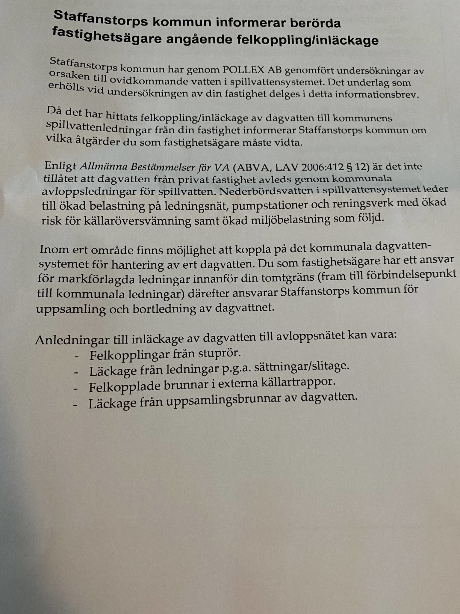 Idag väntade en otrevlig överraskning från kommunen i form av ett brev från Ramboll som de engagerat för att på något sätt undersöka inläckage av "otillåtet" eller "ovidkommande" vatten i spillvattensystemet. Vi bor i ett hus från 1974. Jag tror (?) att vårt dagvatten är kopplat via vår avloppsbrunn som ligger inne på tomten. Kan det vara detta som de nu menar är fel, eller vad kan det vara som de upptäckt? I brevet hävdas det att det står vad jag som fastighetsägare måste vidta för åtgärder, men jag begriper det inte...det pratas om möjlighet att koppla på det kommunala dagvattensystemet?