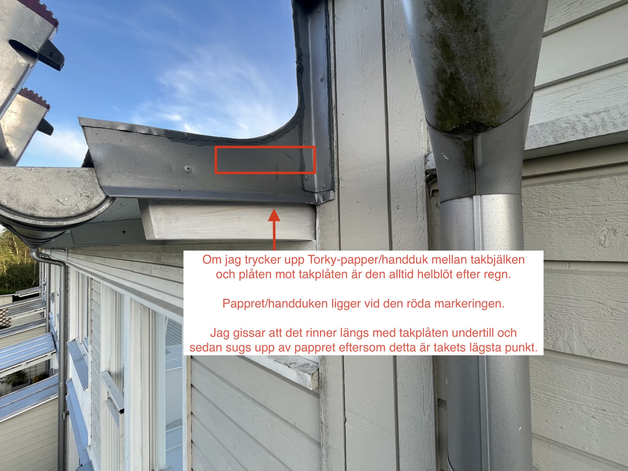 Vi flyttade till ett radhus för 4 år sedan. Jag upptäckte förra året att det läcker in regnvatten under takplåten. Det går att bekräfta genom att man för in Torky-papper (eller en handduk) vid en av takbjälkarna. Efter regn blir det genomblött. (takbjälken var rötskadad men är nu åtgärdad med plastic padding och grundmålning)