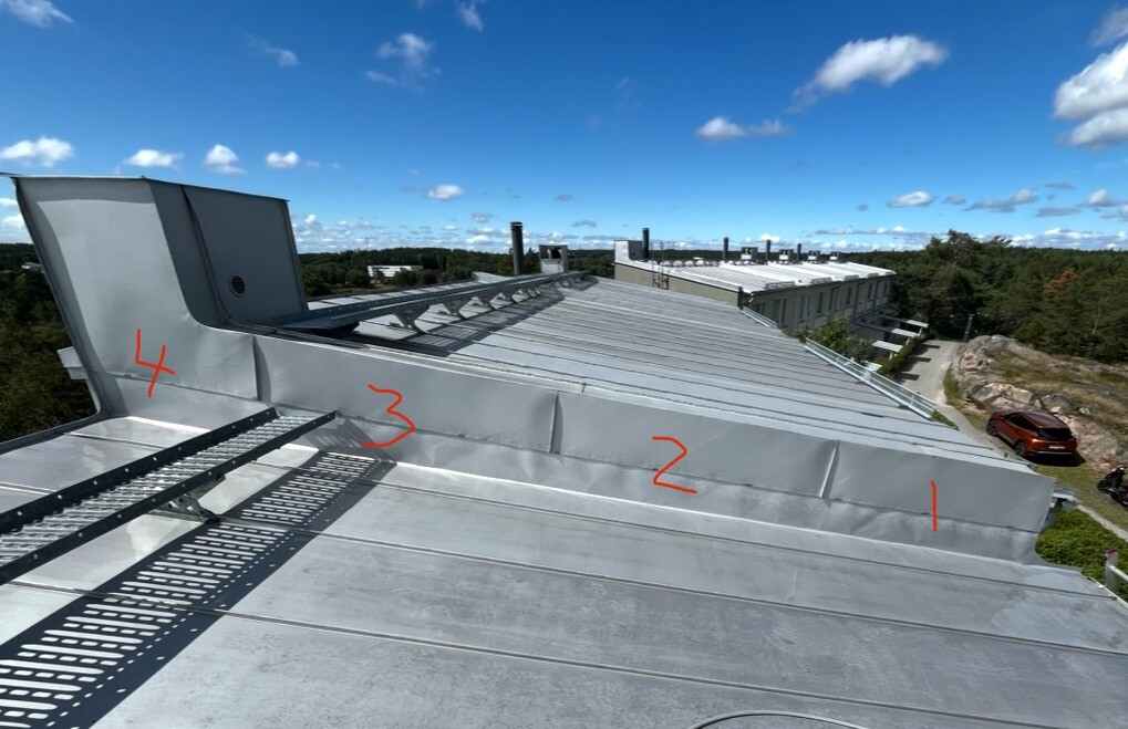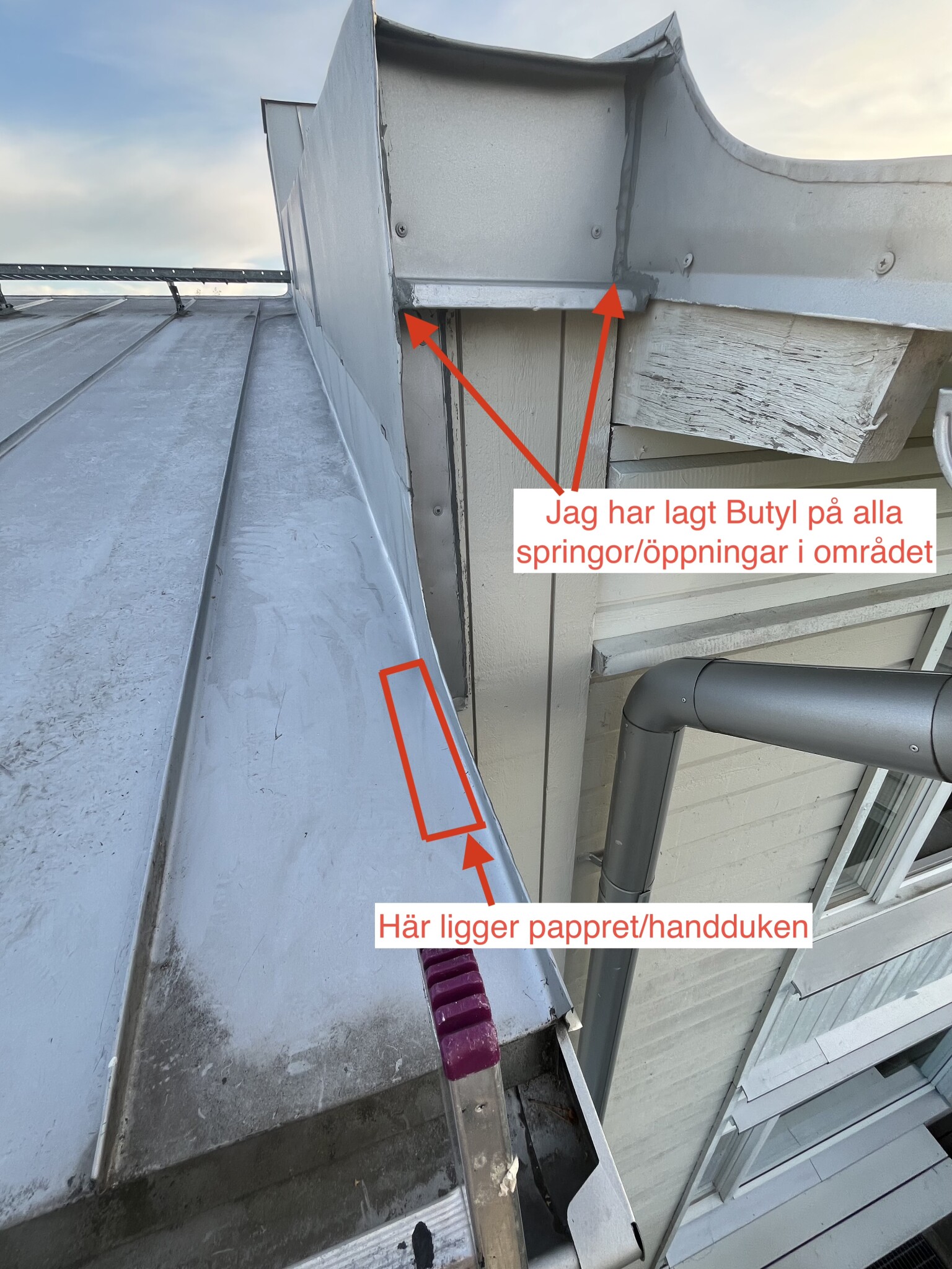 Jag har försökt sätta Butyl på alla skarvar inom området men ingen åtgärd har hjälpt. Jag misstänker nu istället att vattnet rinner längs med takplåtens undersida men jag kan inte se vart det skulle kunna ta sig in.