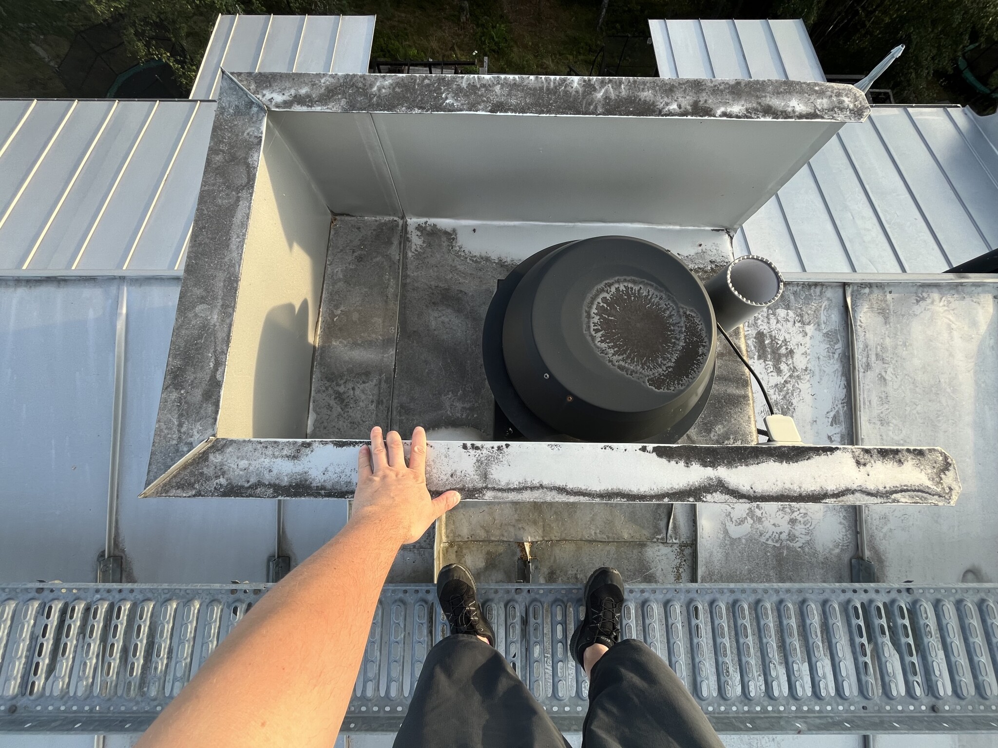 Det regnade hela dagen igår men jag gick upp på taket idag och tog en bild uppifrån. Jag ska testa och se om jag kan återskapa läckan genom att spola vatten (försiktigt).