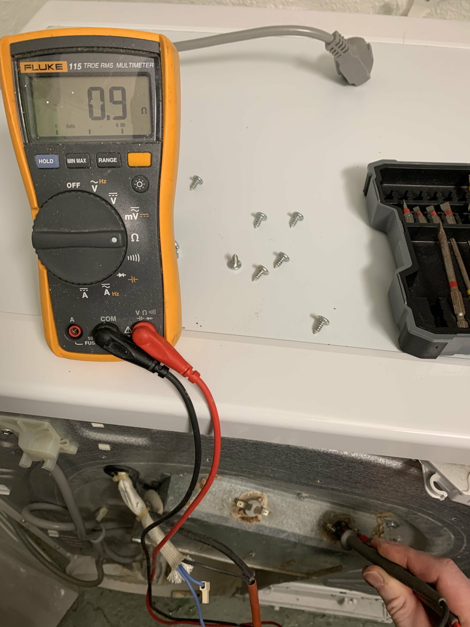 Överhettningsskyddet verkar ok, 0,9 Ohm mätt över det. Däremot visar den andra termostaten på värmelementet 25kOhm