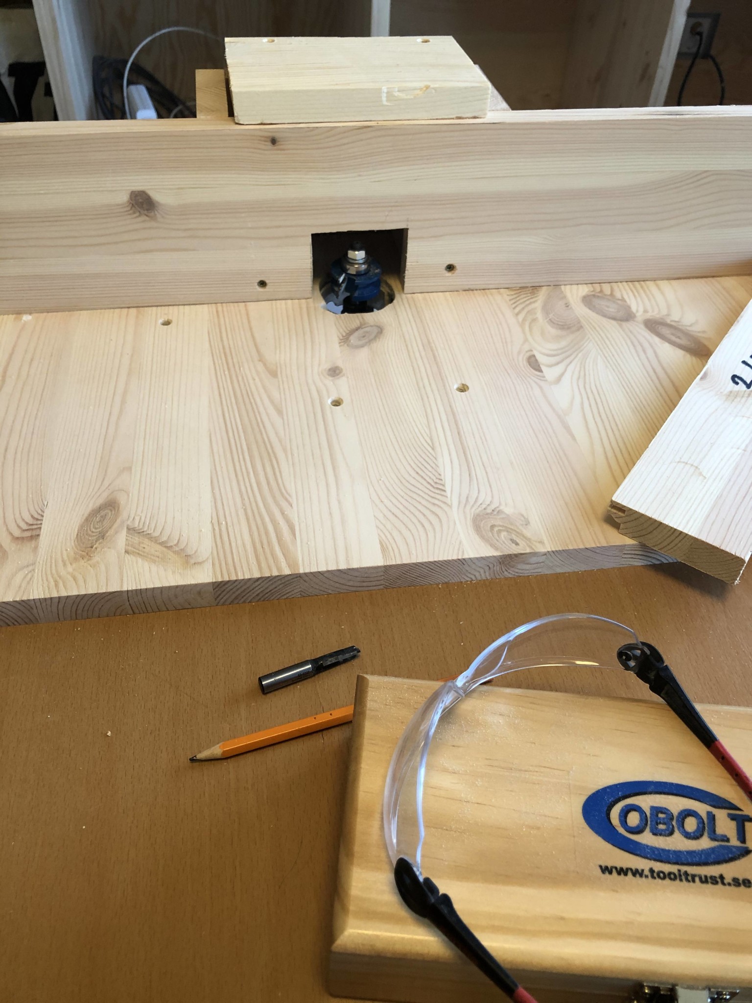 Så här gjorde jag. Sågade ur för glidbordet i ett gammalt bord som jag ska ändå slänga. Vände fräsen upp och ner och lätt den hänga på metallstänger för parallelansllaget. Täckte över det men en träskiva (fräste ur en 14mm djup sänkning för glidbordet som sticker ut över bordet och för metallstänger -6mm ) och skruvade fast skivan mot bordet. Gjorde ett enkelt parallellanslag också med utsug.J jams5387 skrev: