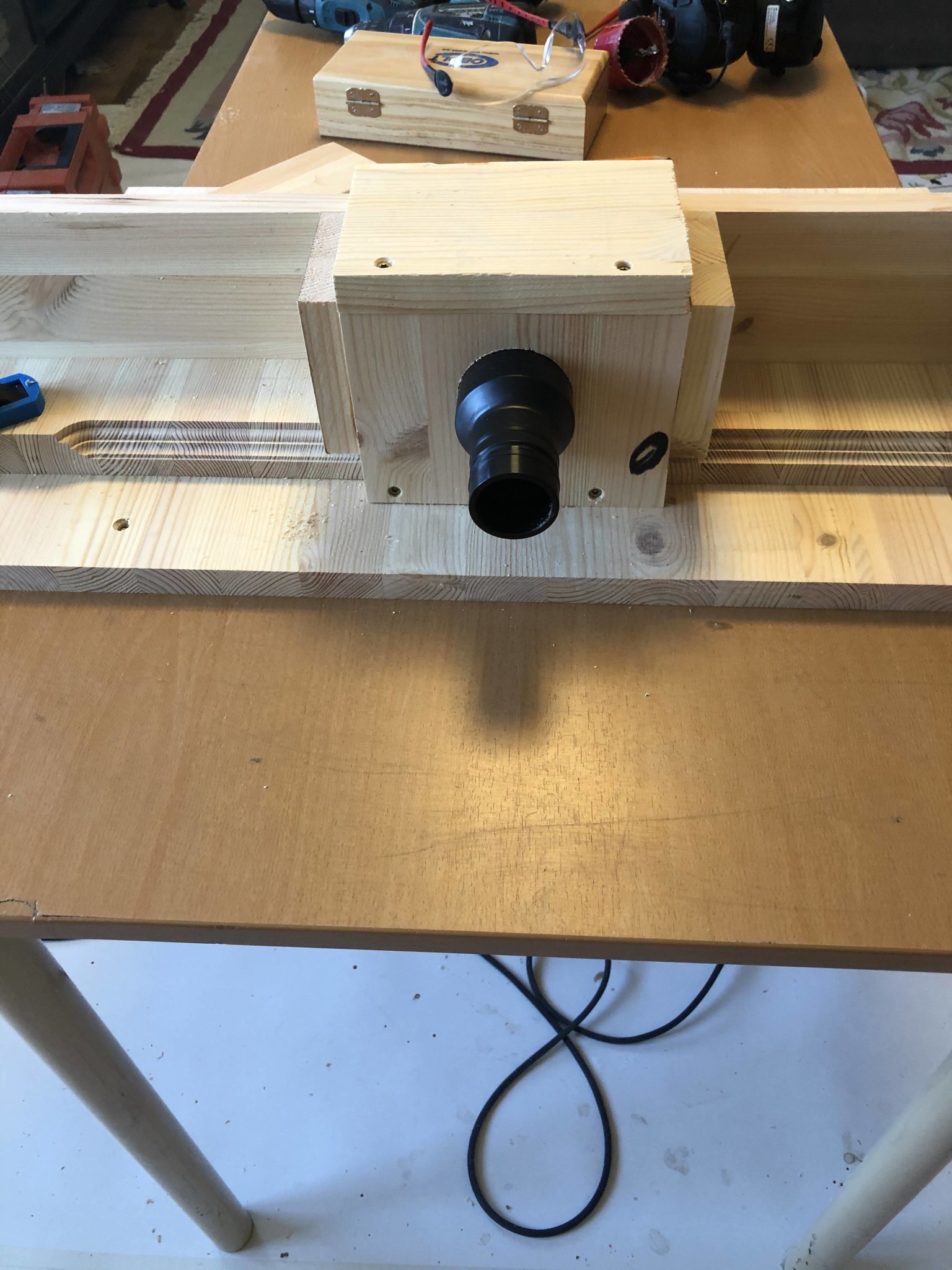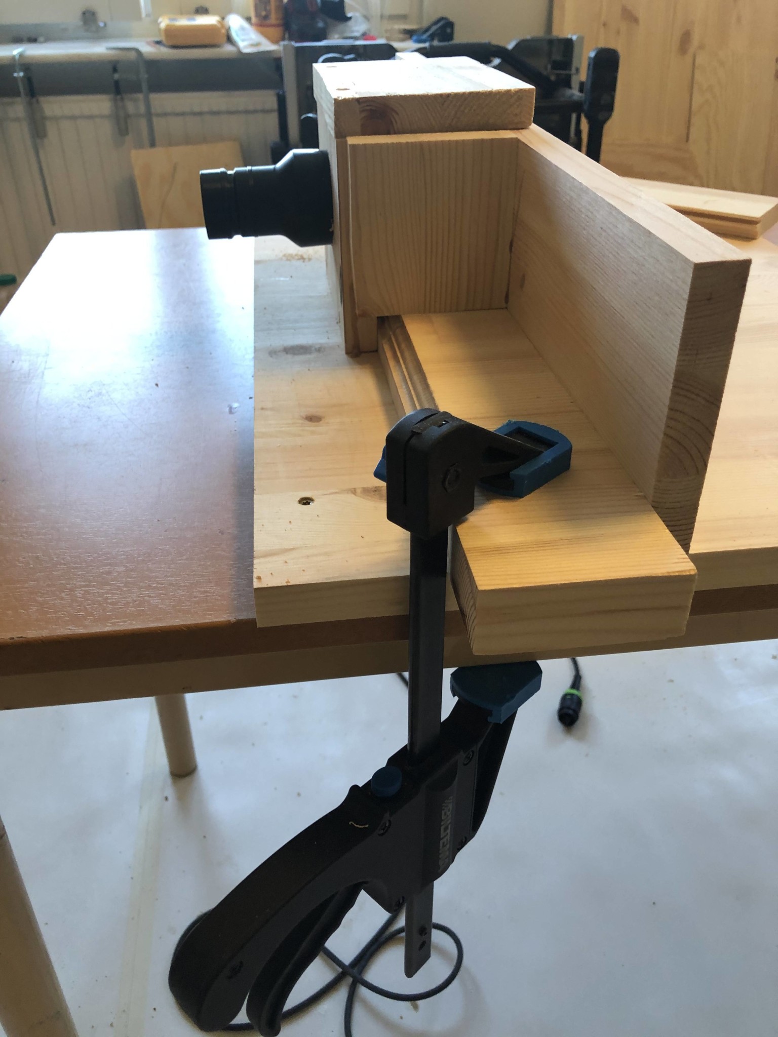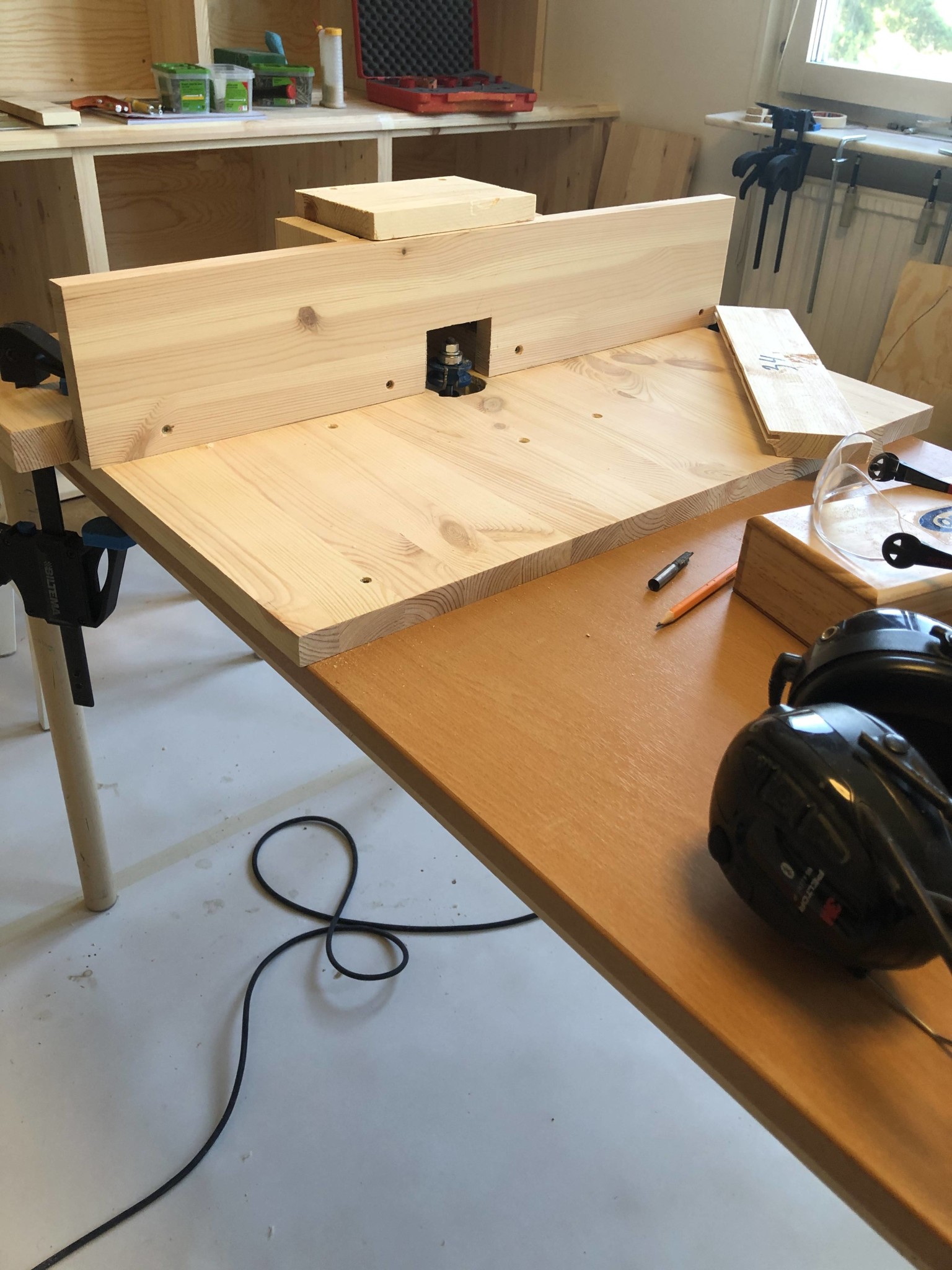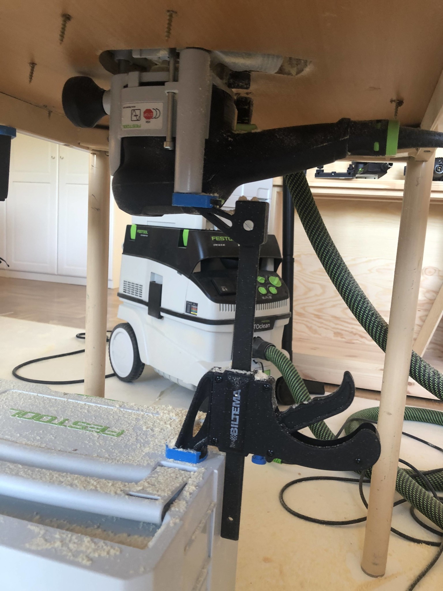 Jag har faktiskt funderat på samma lösning. Jag har ett gammalt kontorsbord som agerar som arbetsbänk och min tanke är att fräsa ett hål i det så att jag kan få fräsbordet jäms med bänkytan.P pyro skrev:När jag använde min 1010 som bordsfräs lite då och då innan jag skaffade en dedikerad fräs tills det hade jag en enkel skiva med hål i som jag la upp på några stadiga bockar. Under skivan hade jag två lister med strategiskt borrade 8mm hål i. Fräsen monterades genom att placeras mellan listerna, stängerna till anhållet träddes genom listerna och hålen i basen på fräsen. Stängerna låstes på plats med låsskruvarna i trädens bas och på så sätt låstes allt ihop på plats.