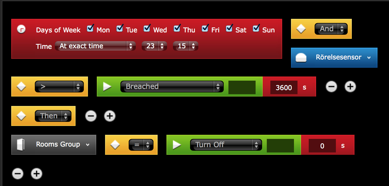 Nybörjarfråga men förstår inte scener helt. Vill att ljuset skall släckas kl 23.15 om rörelsesensorn inte registrerat något senaste timmen. Försökte lägga in enligt nedan men förstår att det inte är rätt. Vad ändrar jag?