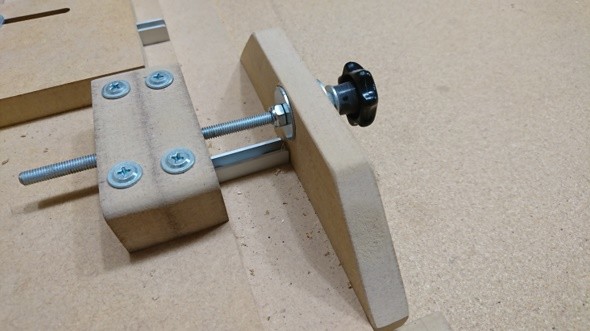 2) Justerskruvarna är gjorda av vanliga gängade stänger (M6), kapade till lämplig längd. De svarta vreden är fixerade med kontramutter. På baksidan av den uppstickande MDF-biten sitter det en låsmutter som dras åt lagom mycket för att få minimalt glapp utan att det blir trögt att vrida. Brickor mellan alla muttrar och MDF. Den lilla klotsen som gängstången går in i är bara två hoplimmade MDF-bitar med ett hål igenom där jag monterade en islagsmutter i den ena biten innan jag limmade ihop dem (det är förstås försänkt för islagsmutterns skalle, eller vad man nu skall kalla den).