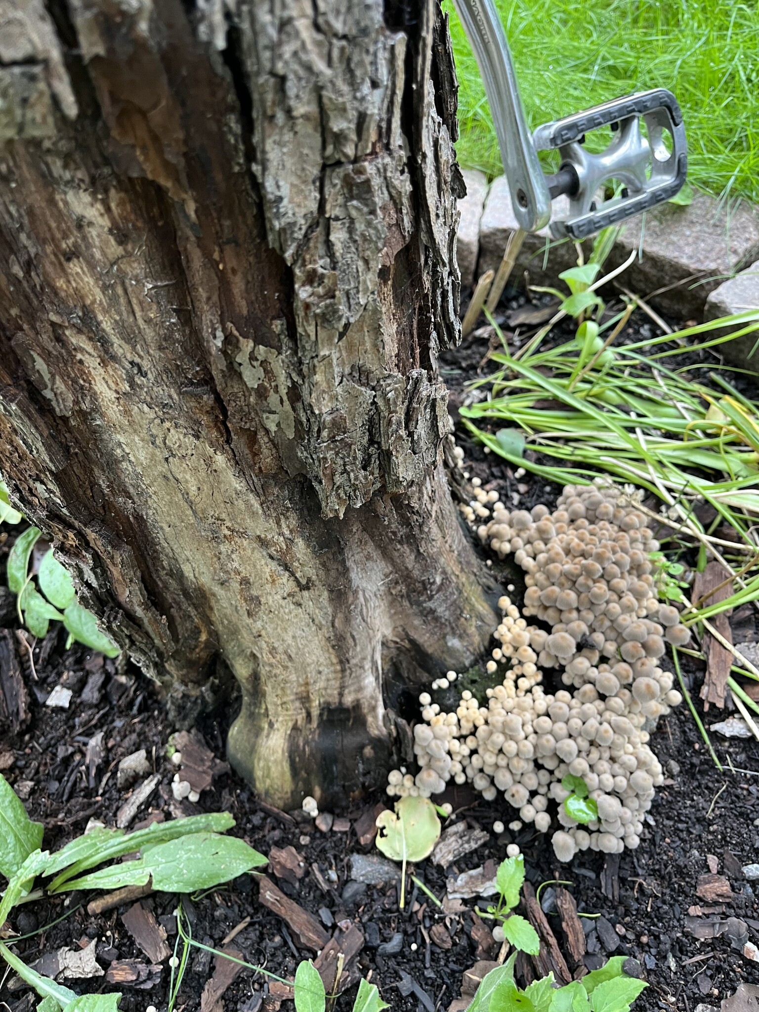 dessa små svampar växer i jorden runt stammen samt att trädet tappar bark nedtill.