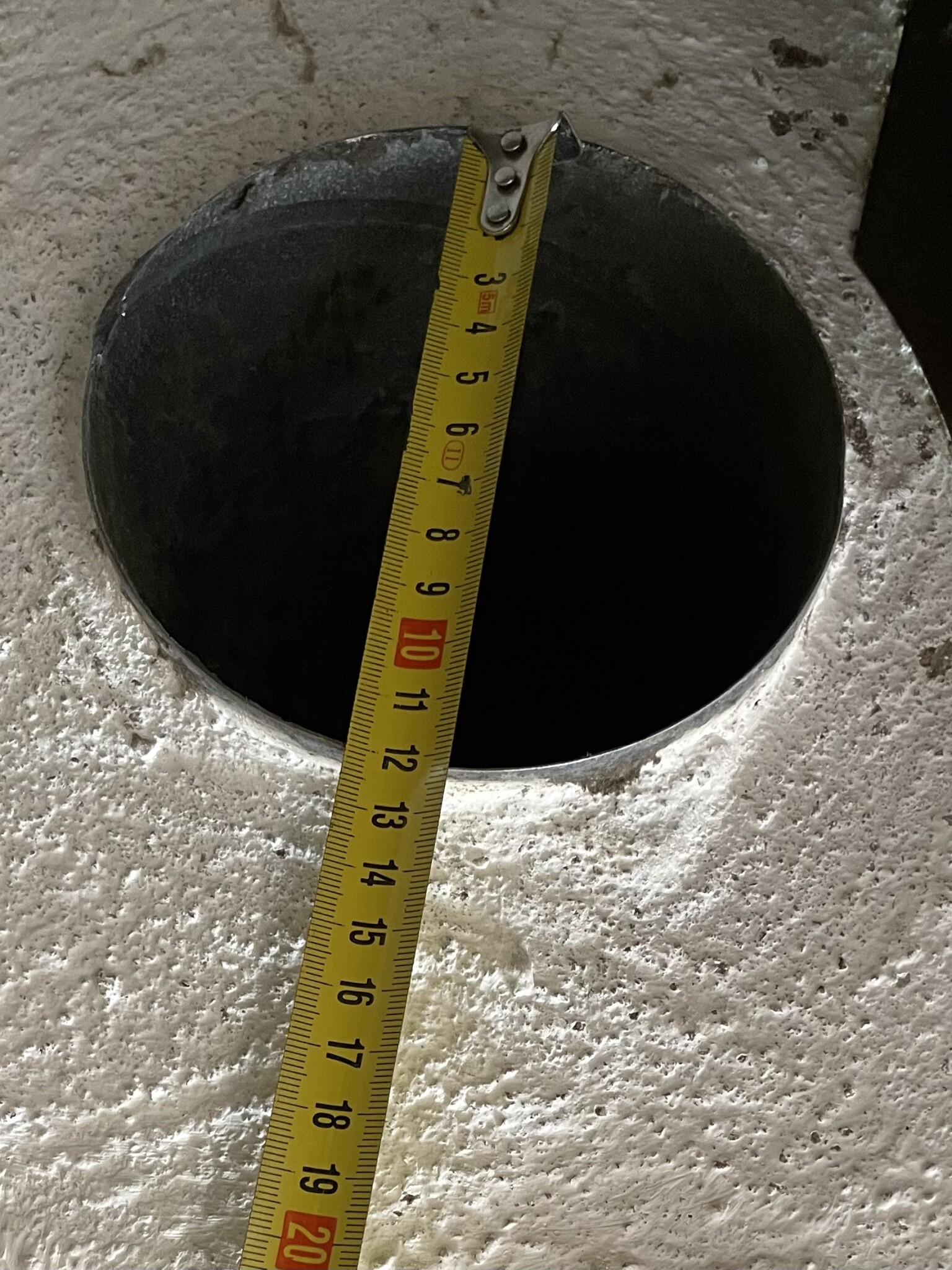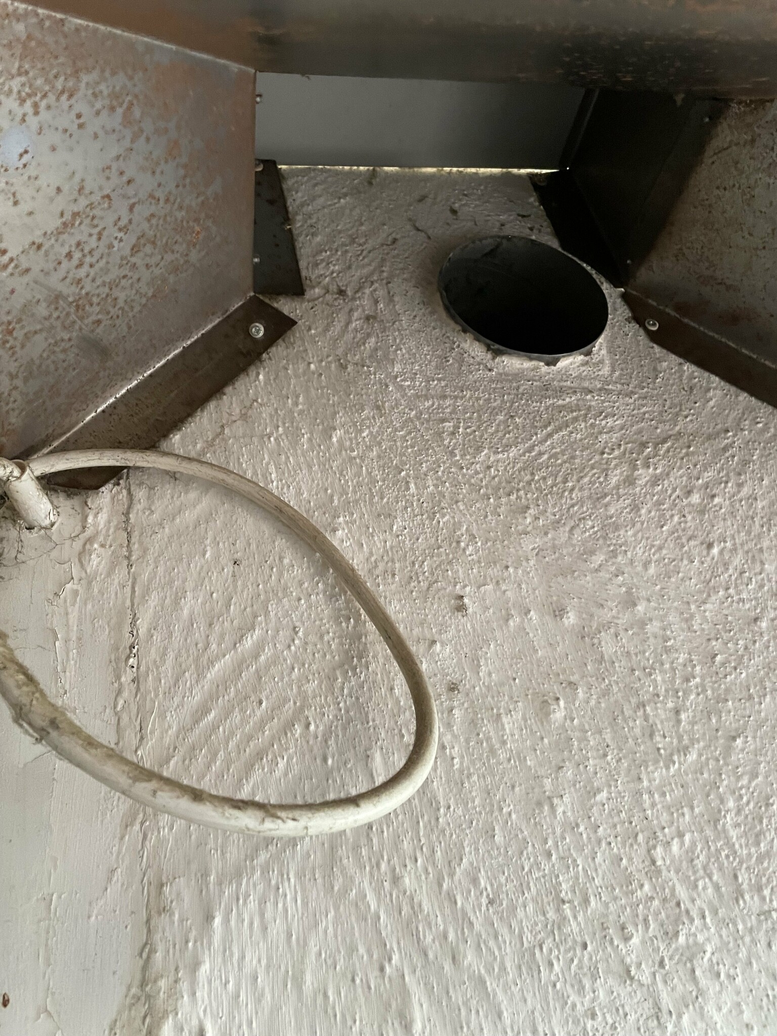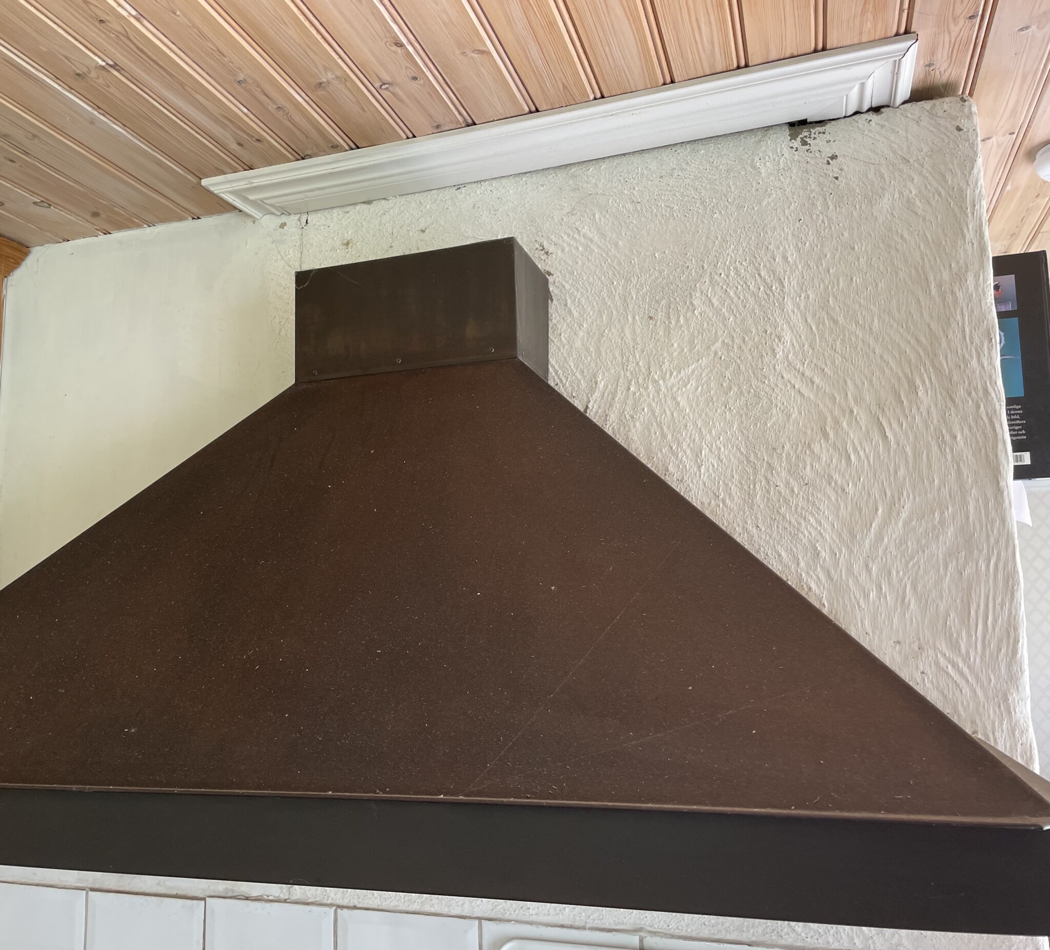 Har en stor spiskåpa över spis och vedspis med framdragen el. Från skorstenen är ett plåtrör på 12 cm diameter men det finns ingen fläkt.