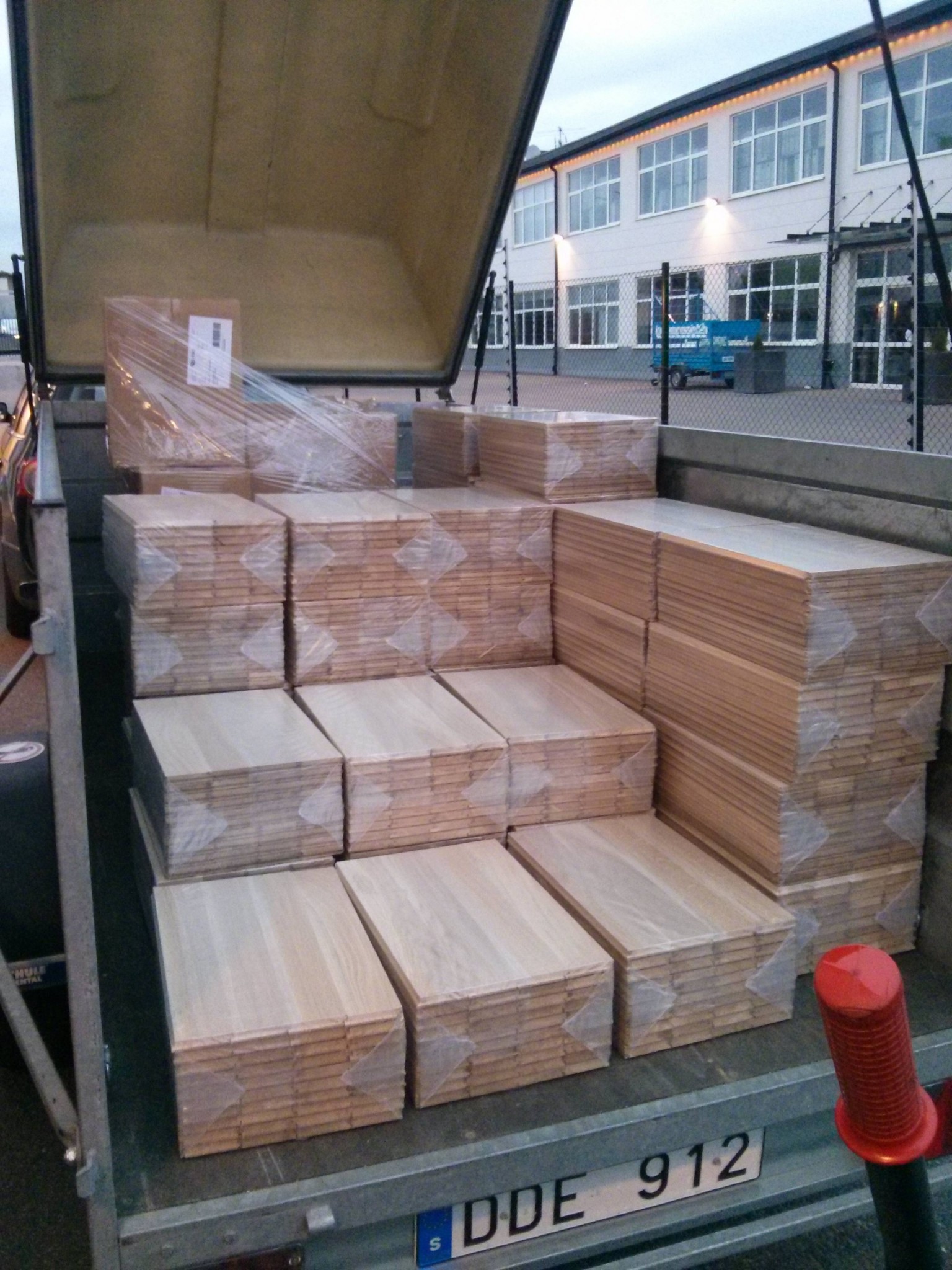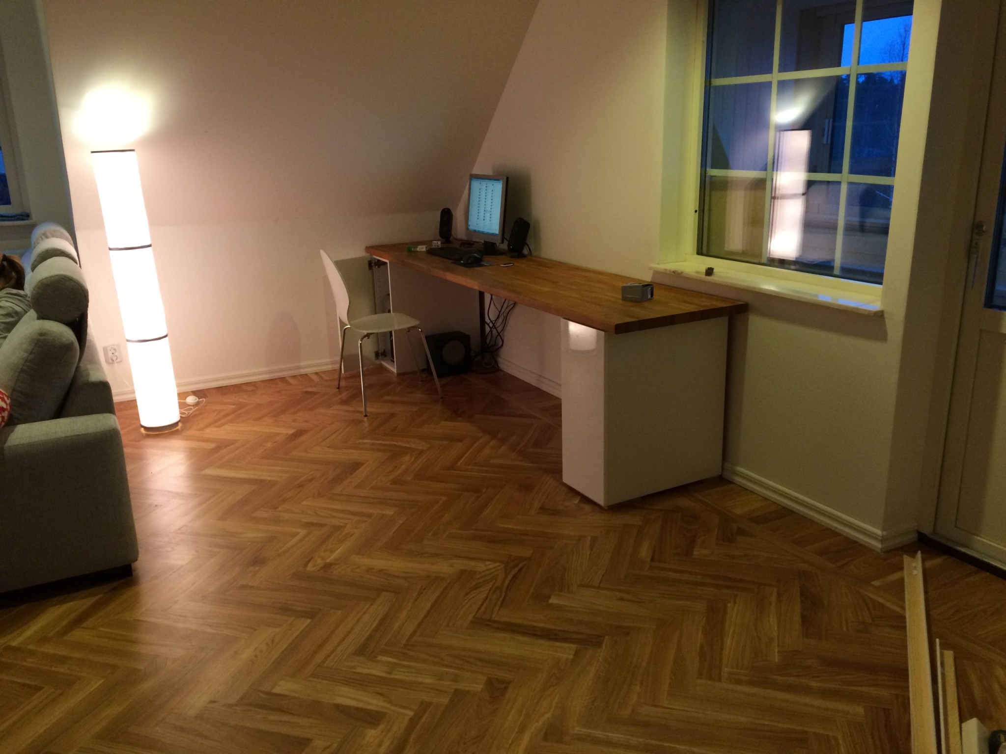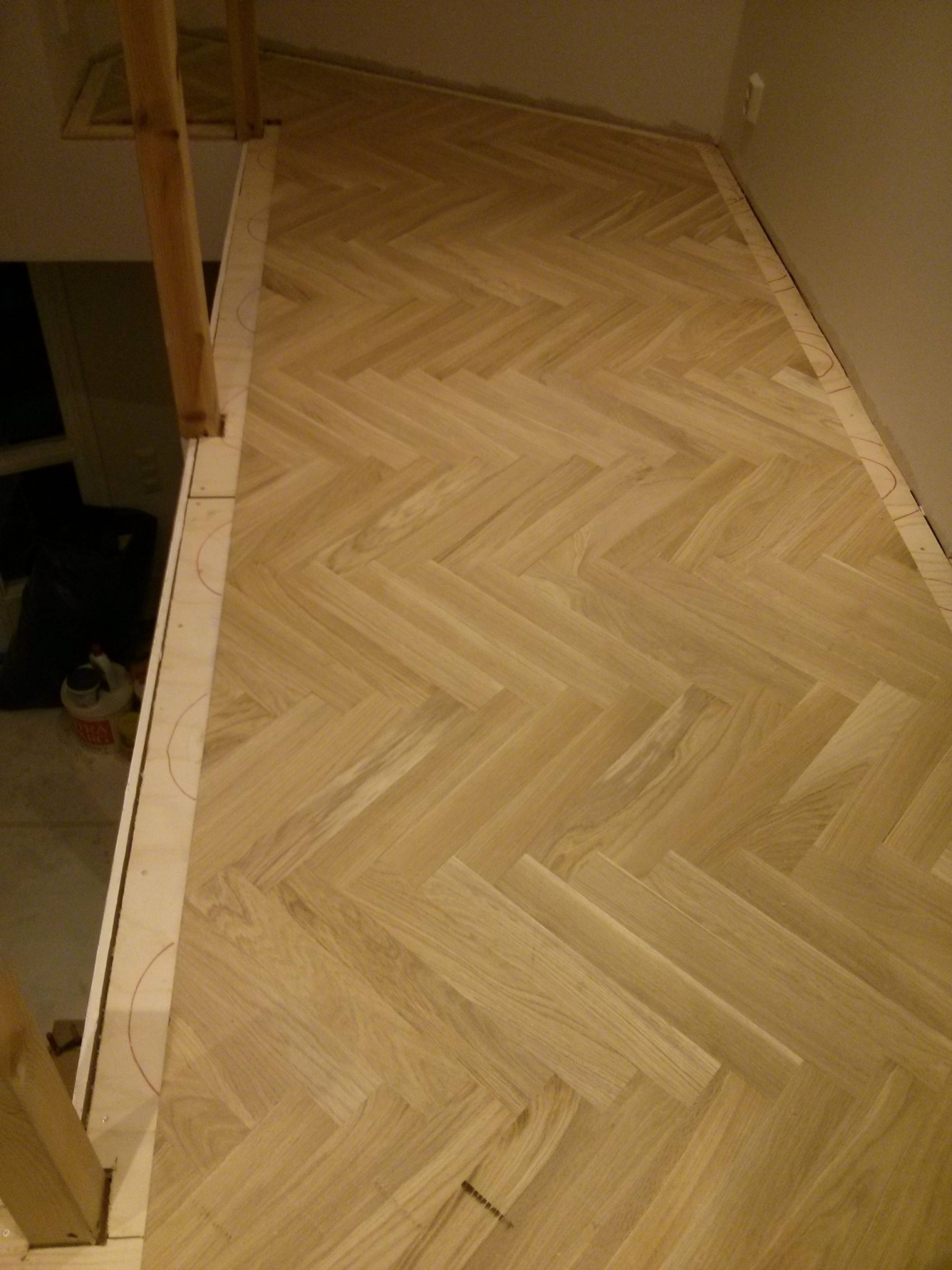 Räkna med ungefär en helg för förarbetet (plywood m.m.), en helg för läggningen av själva fiskbenen, en helg för listband och fris, och slutligen en helg för slipning och oljning.tank77 skrev: