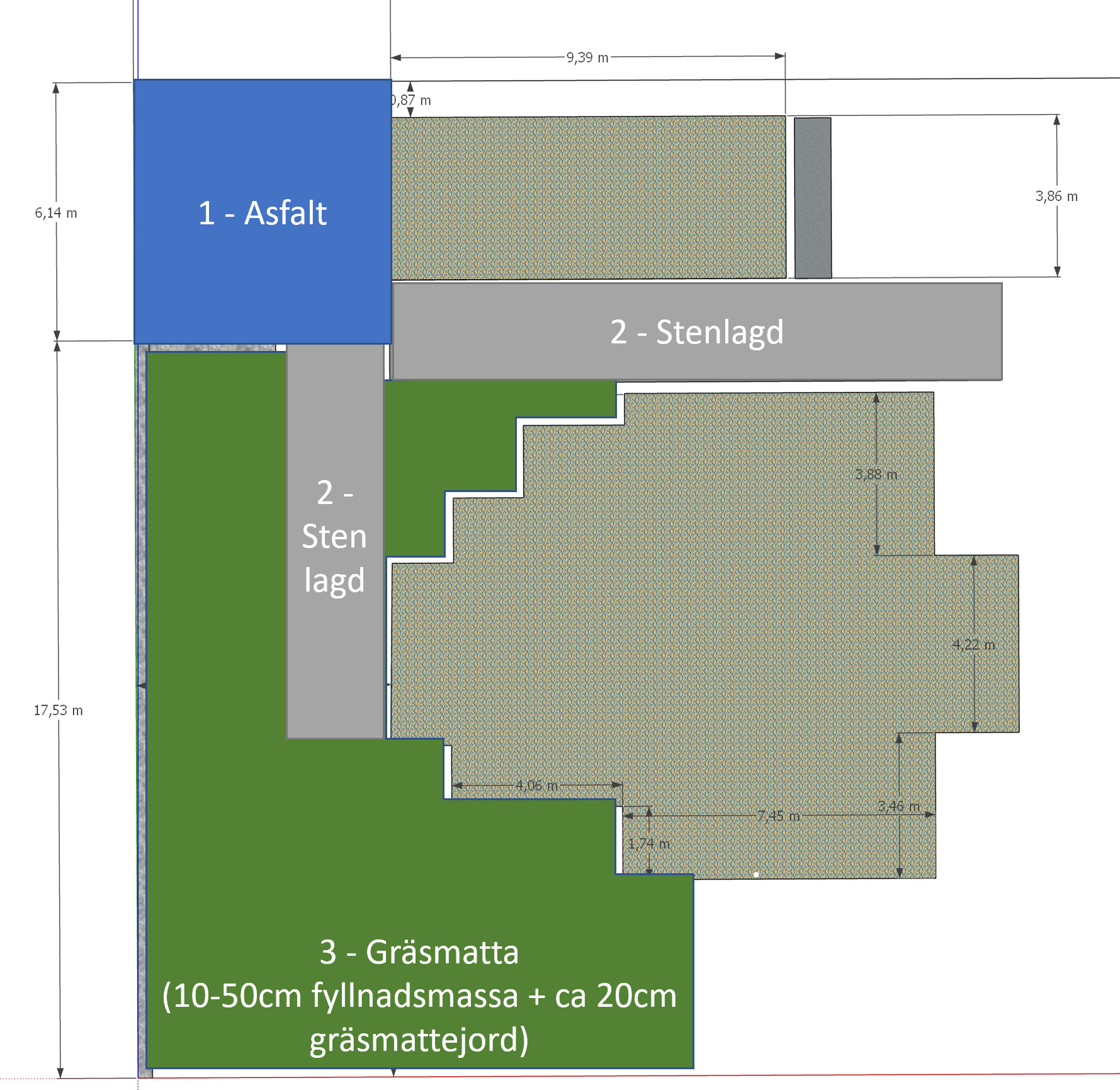 - Delen som skall stenläggas, hur mycket lägre skall den vara för at få plats med rätt material under (har inte för avsikt göra den delen själv men vill skapa rätt förutsättningar).?