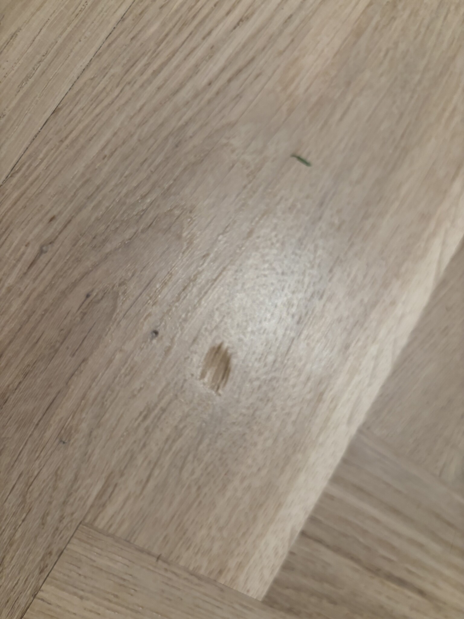 Vi har lagt ny parkett och noterat detta fula djupa märke på ett väldigt exponerat ställe på golvet. Någon som vet hur man kan fixa det på ett snyggt sätt?