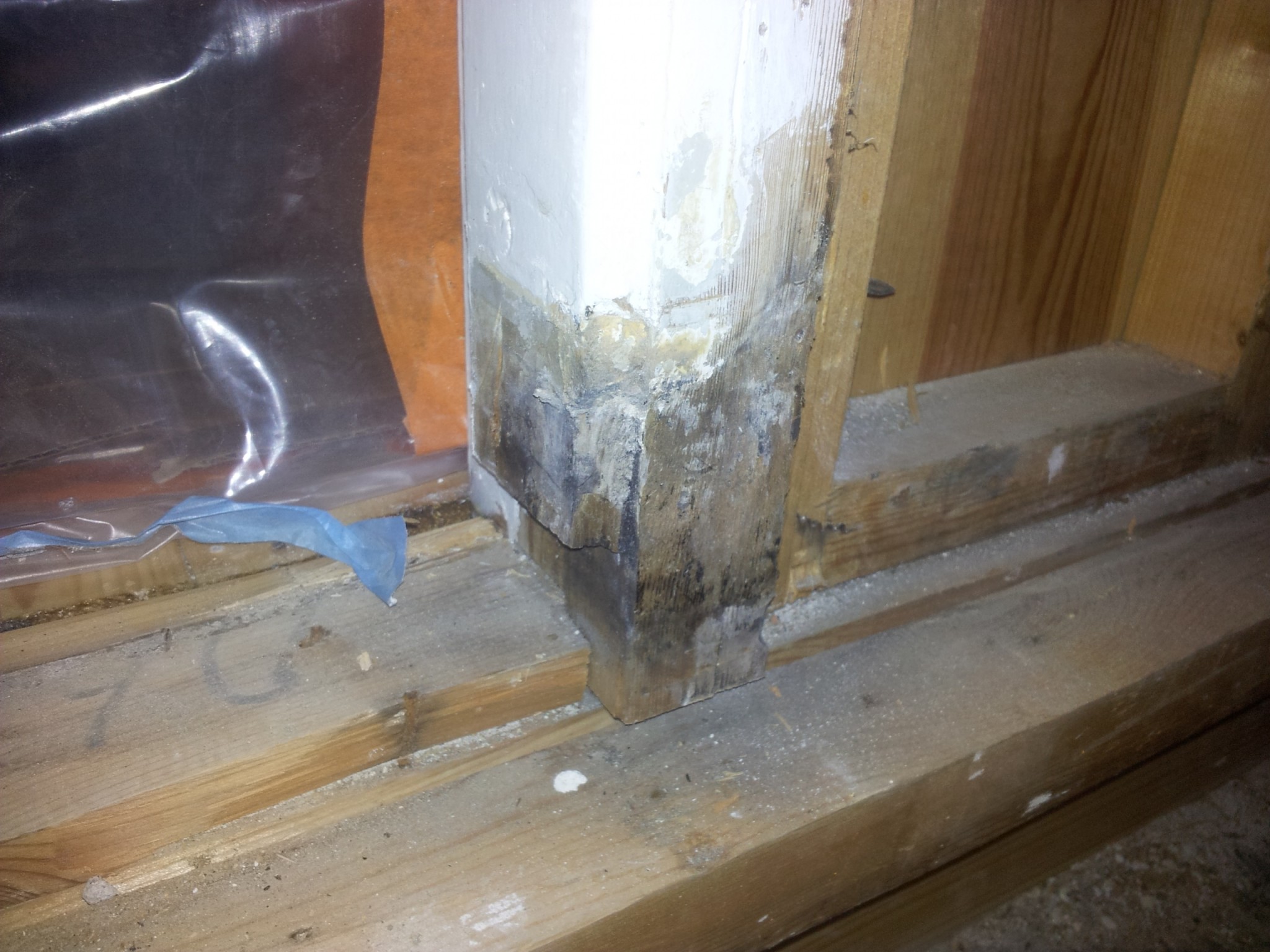 Närbild. Träet är aningen mjukare på ytan in mot rummet.. Kan det vara rötsvamp?