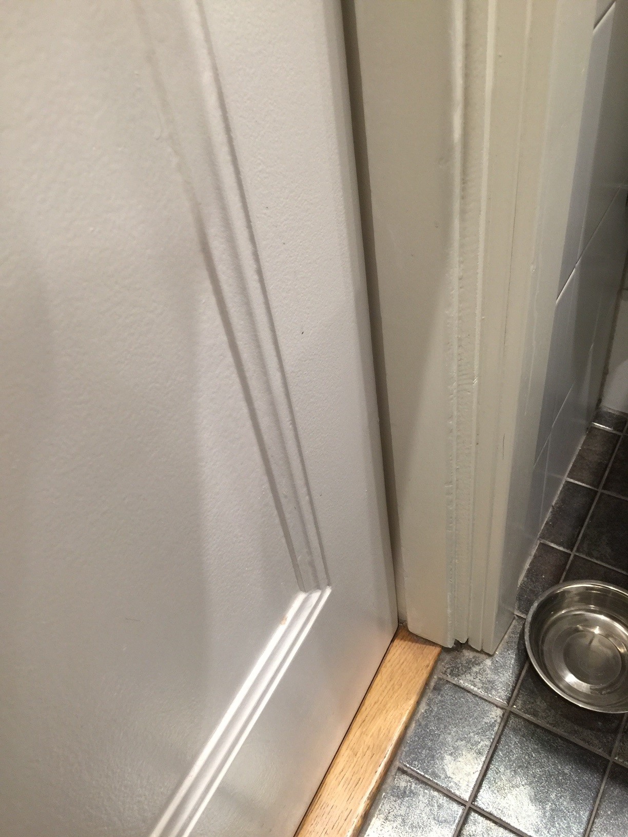 Toalettdörren gick inte att stänga när vi flyttade in pga karmen och tröskeln sitter olika av någon konstig anledning, se bild nedan. Löste detta genom att fräsa ut lite i nederkant av dörren som quickfix. Dock går dörren inte igen perfekt, man får dra i den för att stänga, då dörren spänner mot karmen.
