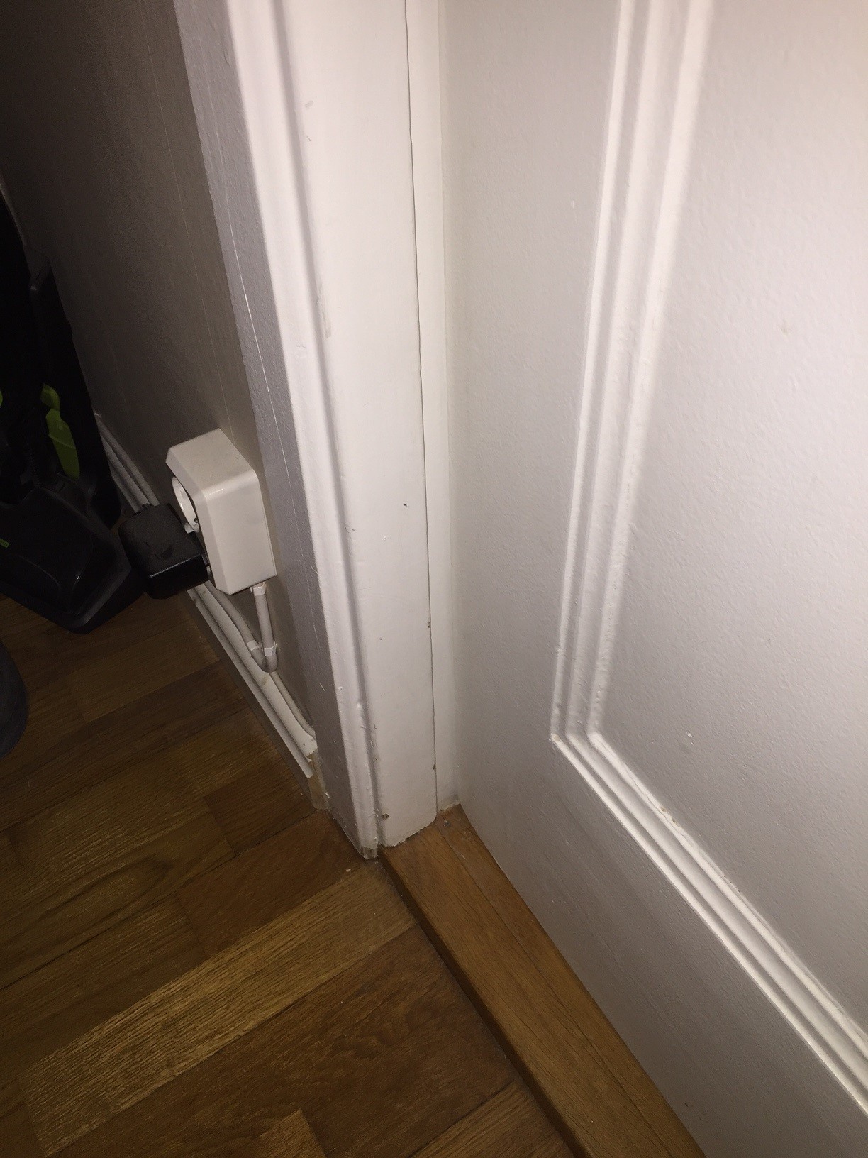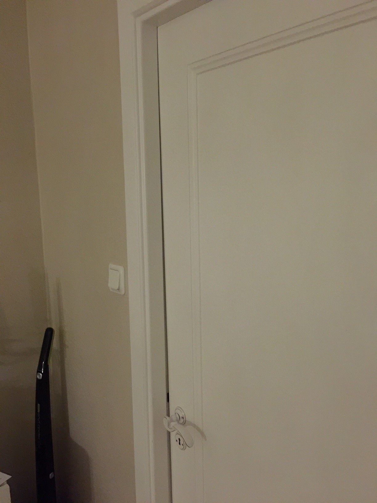 Sovrumsdörren är även den skev, tror det är ca 2-3 cm mellan karm och dörr i nedre hörnet under handtaget. Så väldigt skev med andra ord, går ju se på bilderna nedan hur det ser ut. Känns dock dumt att anpassa karm och tröskel efter dörren, här kanske det är smartare att åtgärda dörren. Dock funderar jag på byta ut tröskeln då den är för hög för vår Neato Botvac.