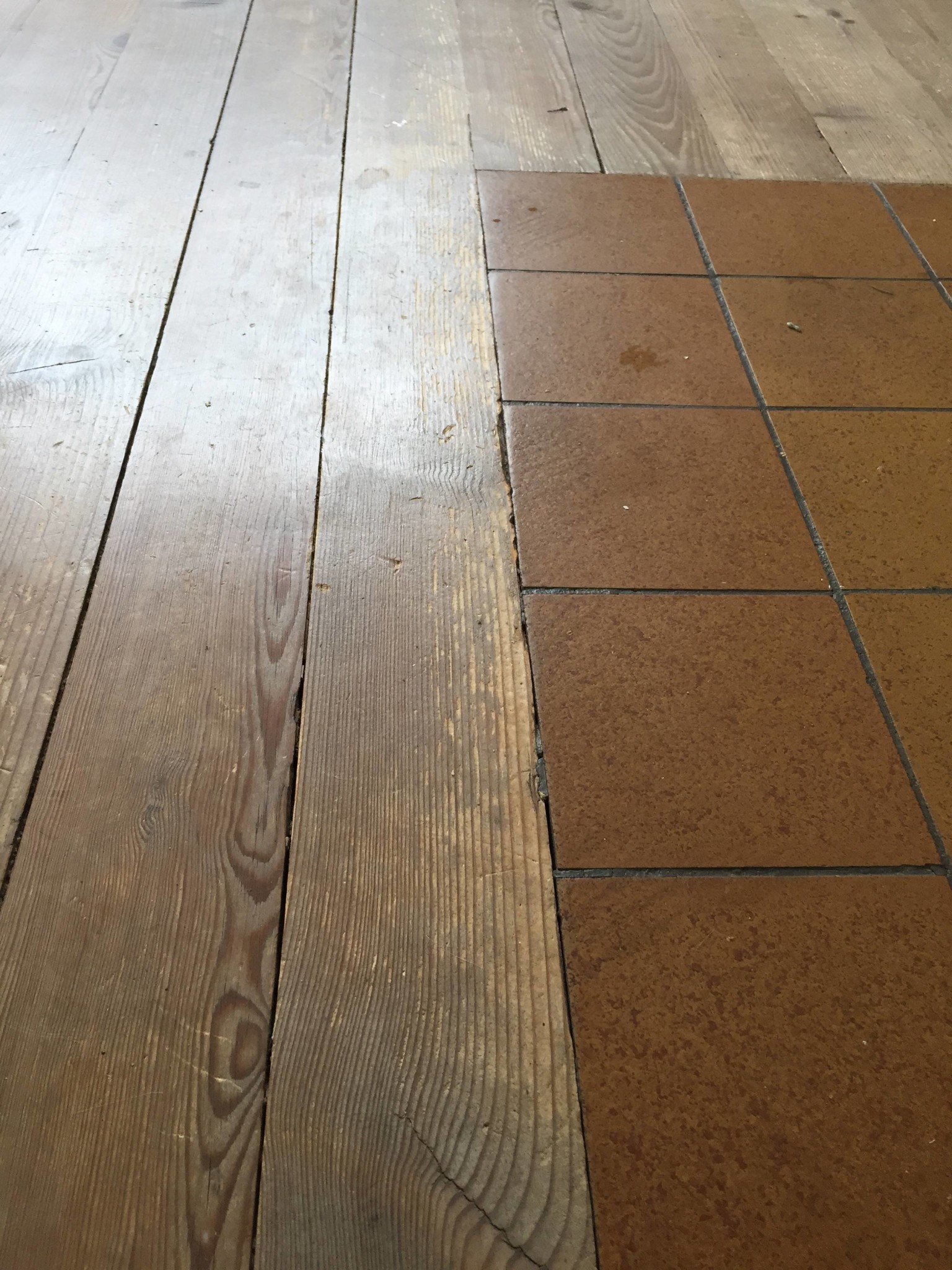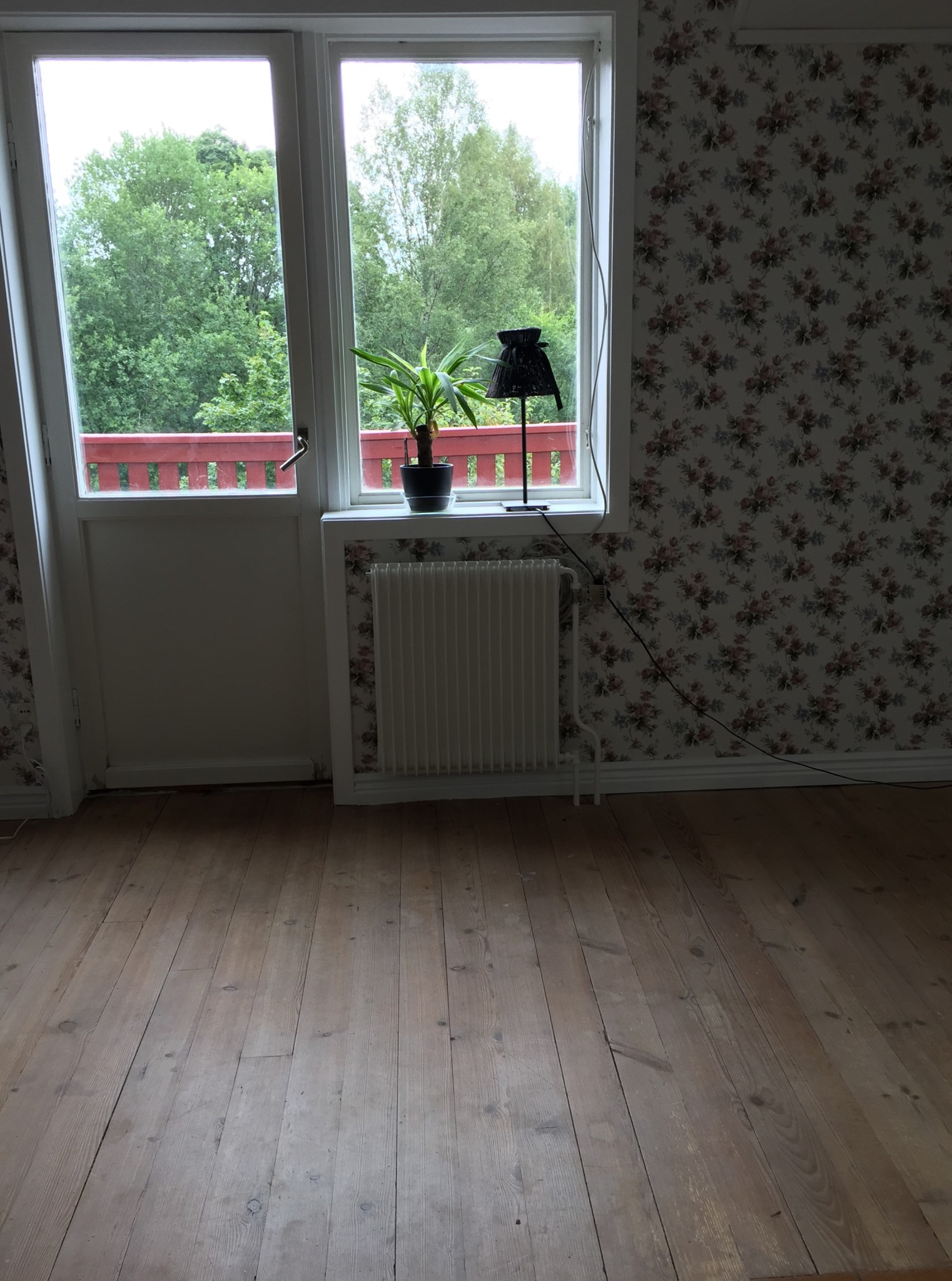 Ett fint trägolv ligger och det är mjukt att gå på, fint såpabehandlade tror jag.