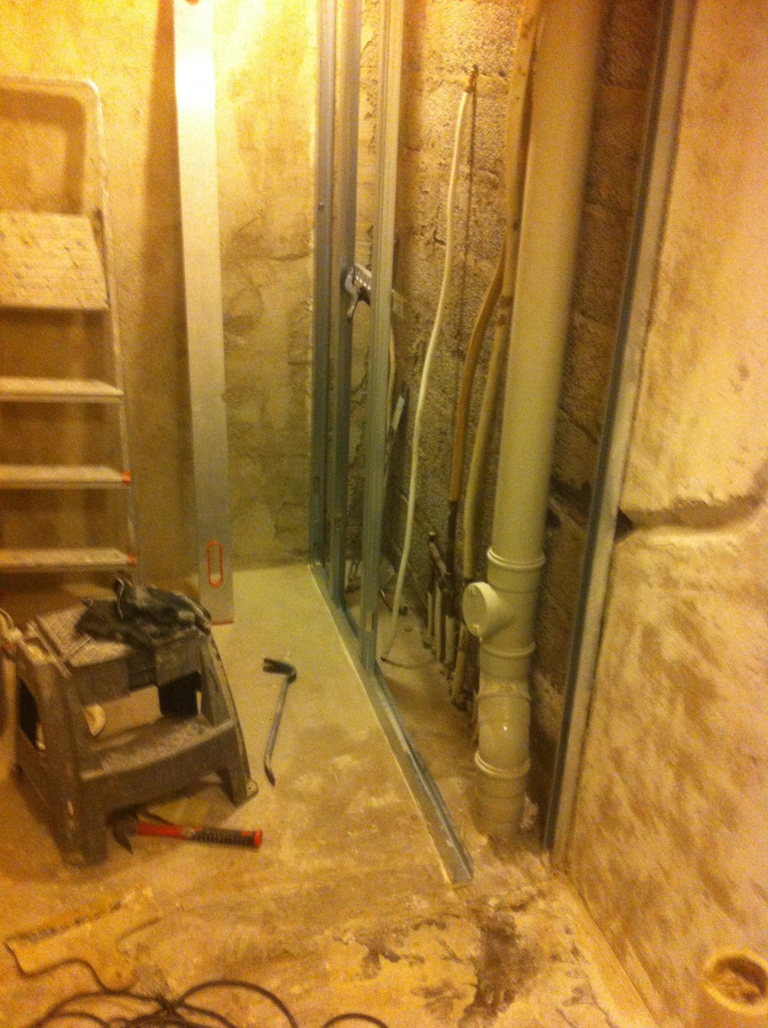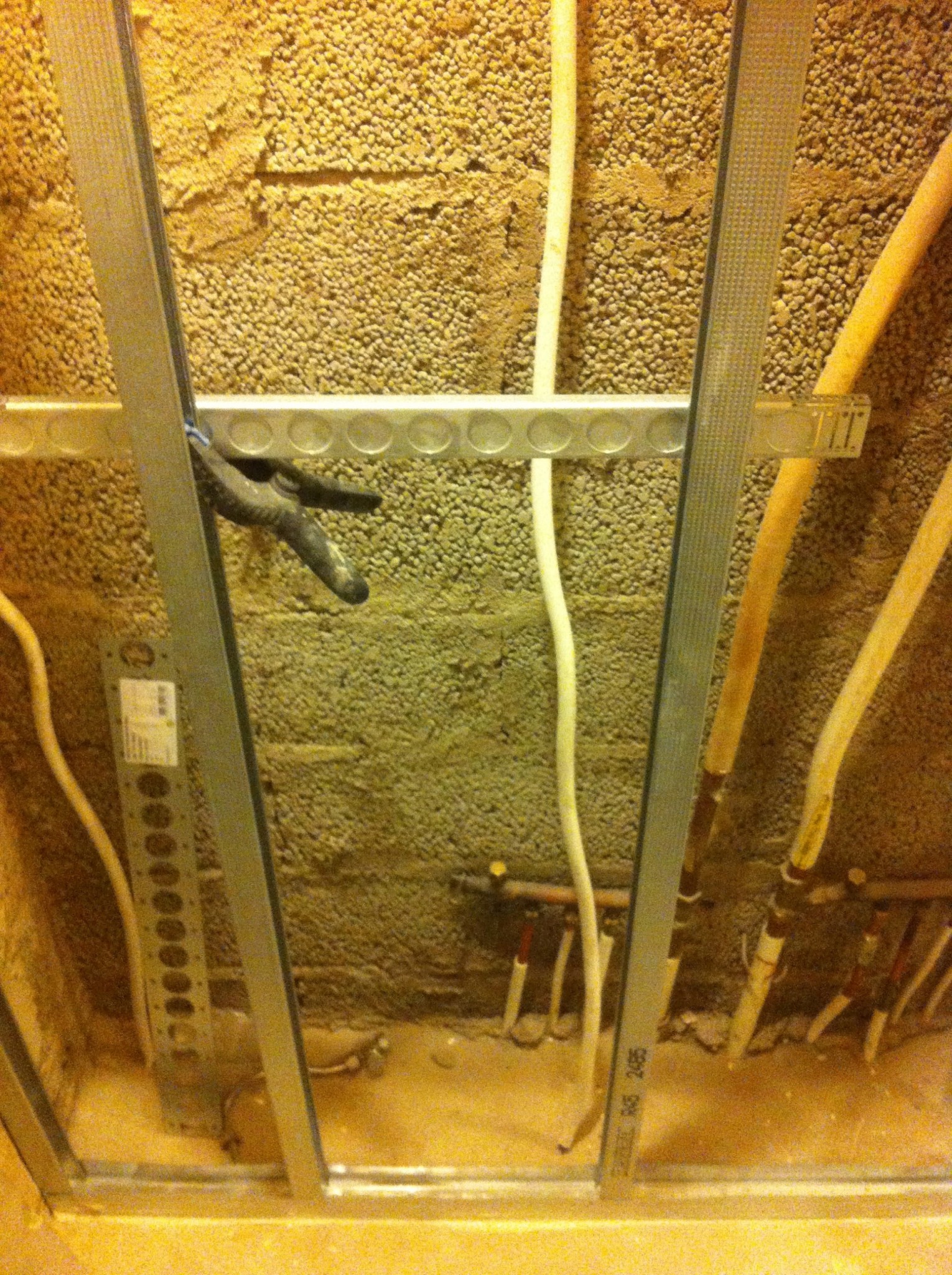 Bygger upp en vägg mot rör, 45x45 plåtreglar på 300 cc och tanken är en 13 mm våtskiva och tätning och kakel på det. Blir en inspektionslucka och skvaller hål för ev läckage också.