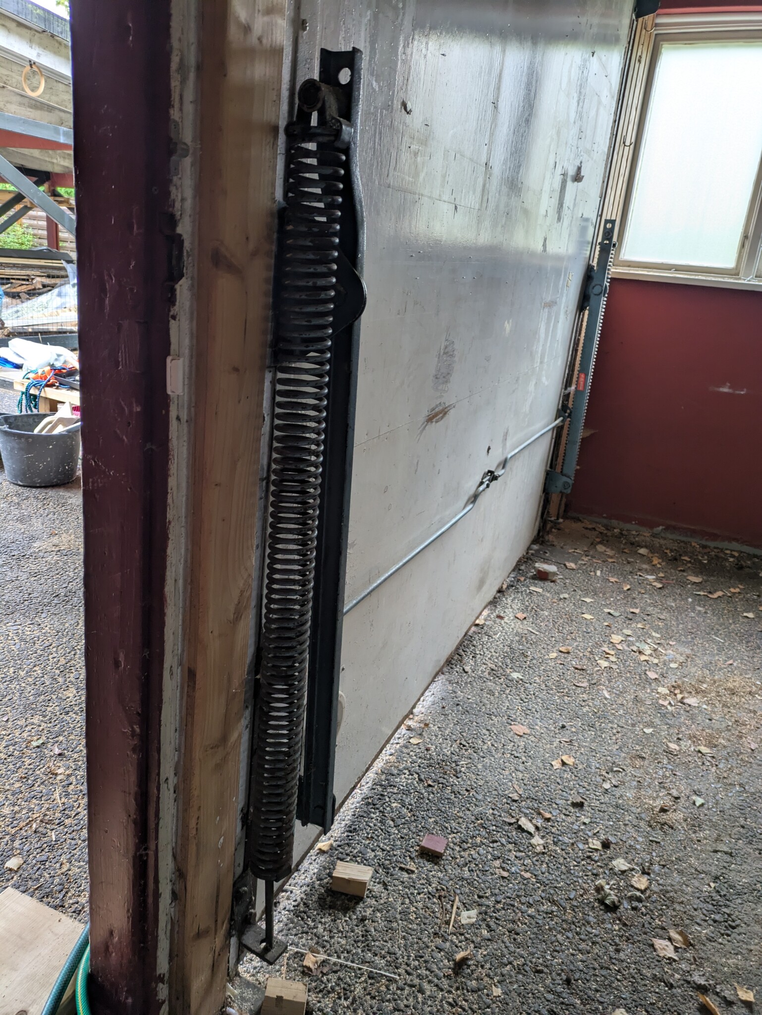 Planen är att ställa porten i öppet läge och stadga upp med reglar. Dra en vajer genom vardera fjäder som fästes upptill och nedtill på väggen. Därefter lossa bulten högst upp på varje fjäder.