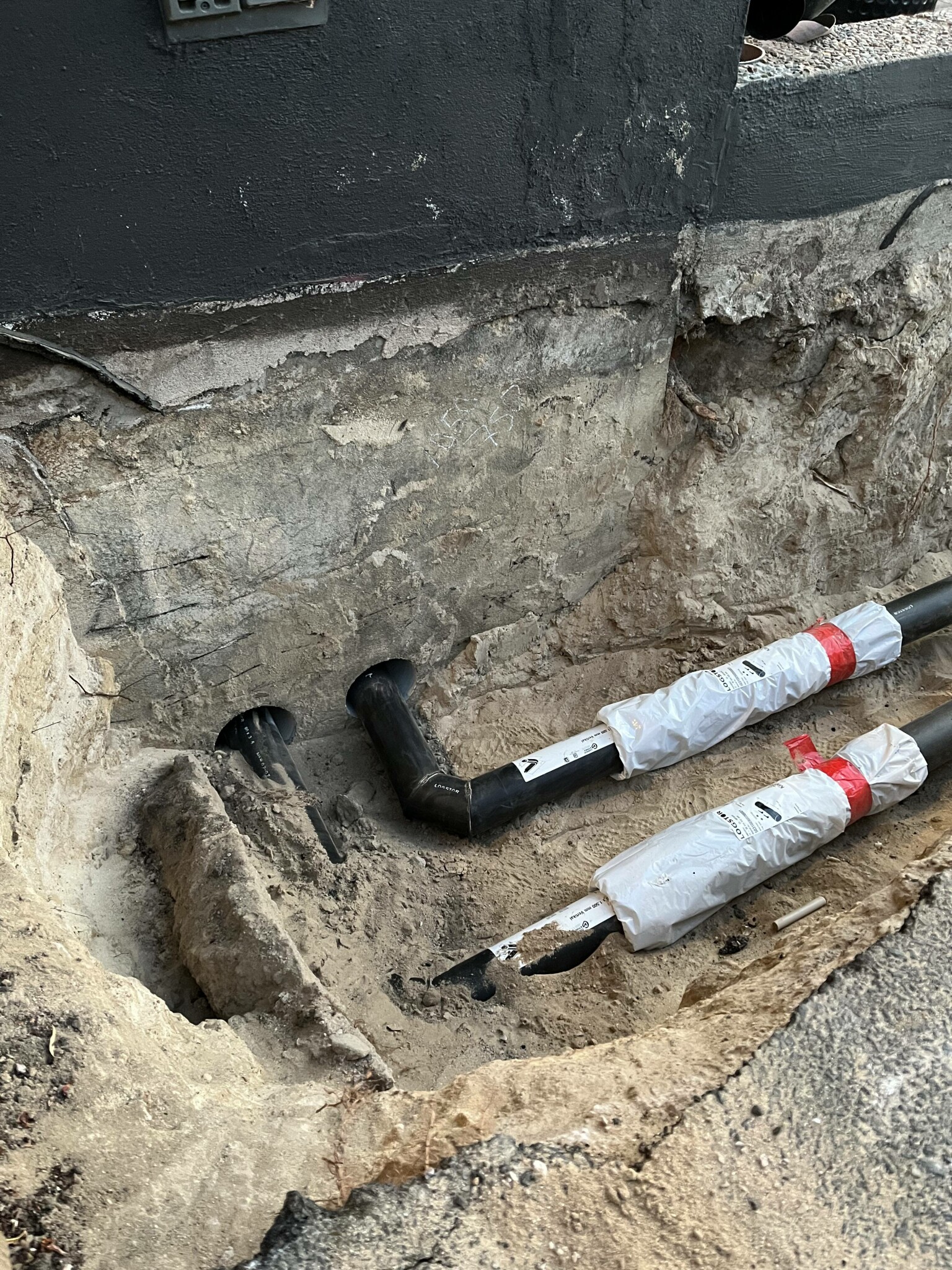 när jag kom hem igår hade en rund pelarbit av siporex ramlat ner i hålet och landat på ett av rören… det var en av bitarna de skurit ut ur väggen vid håltagningen